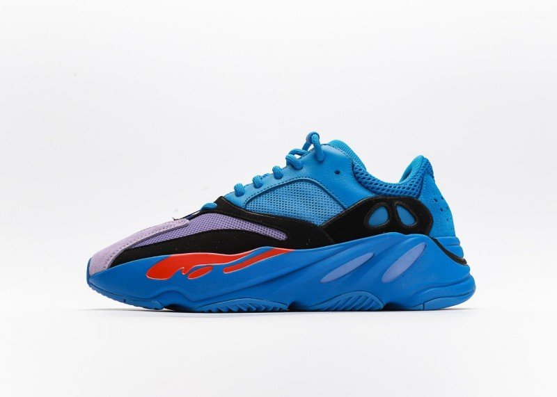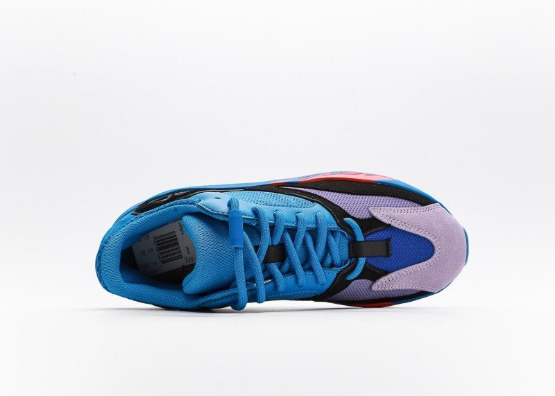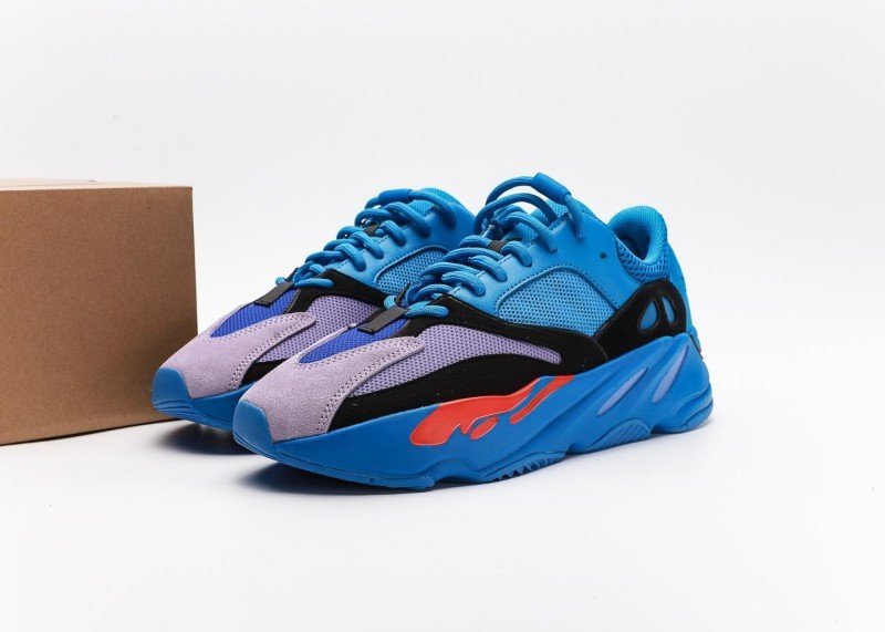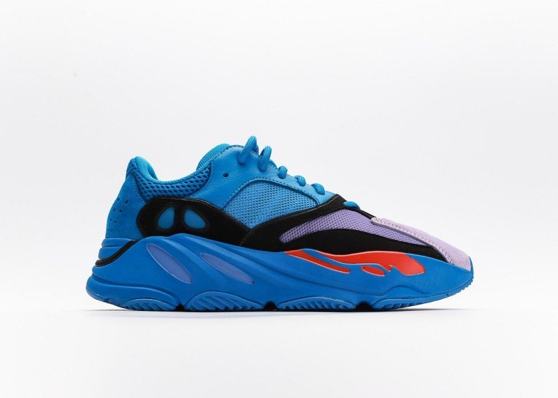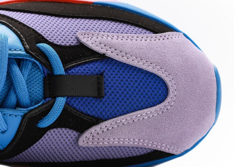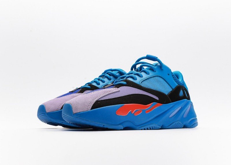 The shoe body is mainly bright blue with light purple toe cap, creating striking color contrast. Red flame pattern below the black decorative band adds visual impact and style.