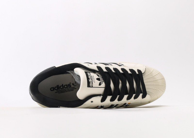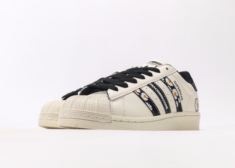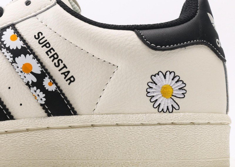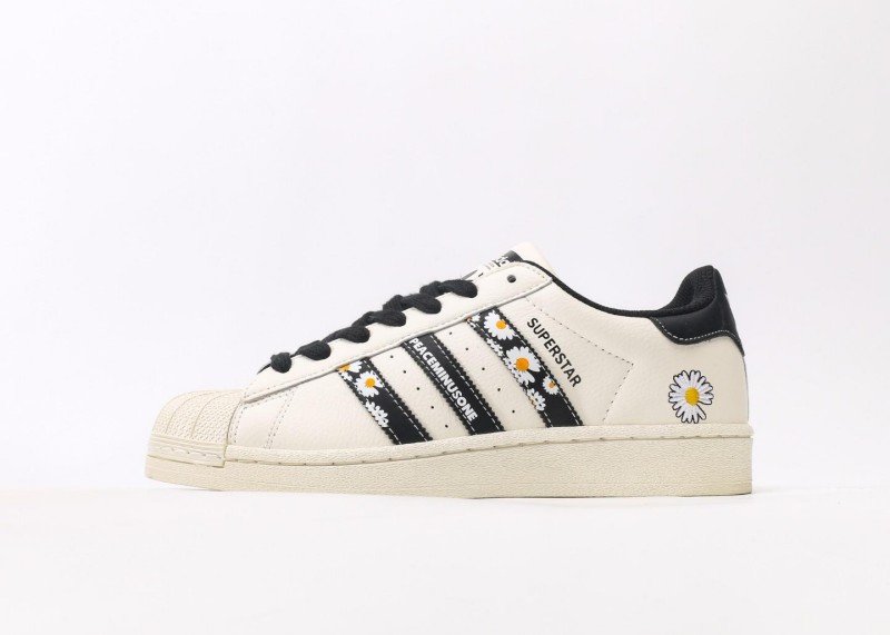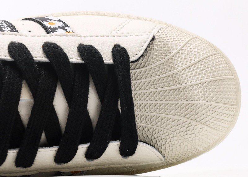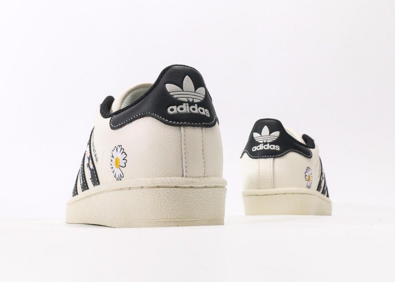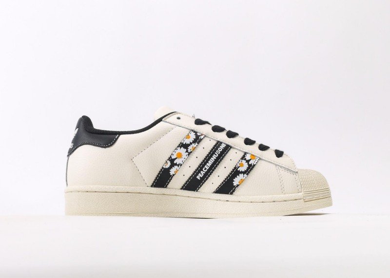 This collaborative Superstar sneaker by adidas and PEACEMINUSONE features a cream upper with black three stripes adorned with white daisy patterns, complemented by “PEACEMINUSONE” and “SUPERSTAR” lettering, and a white daisy embroidery on the heel.