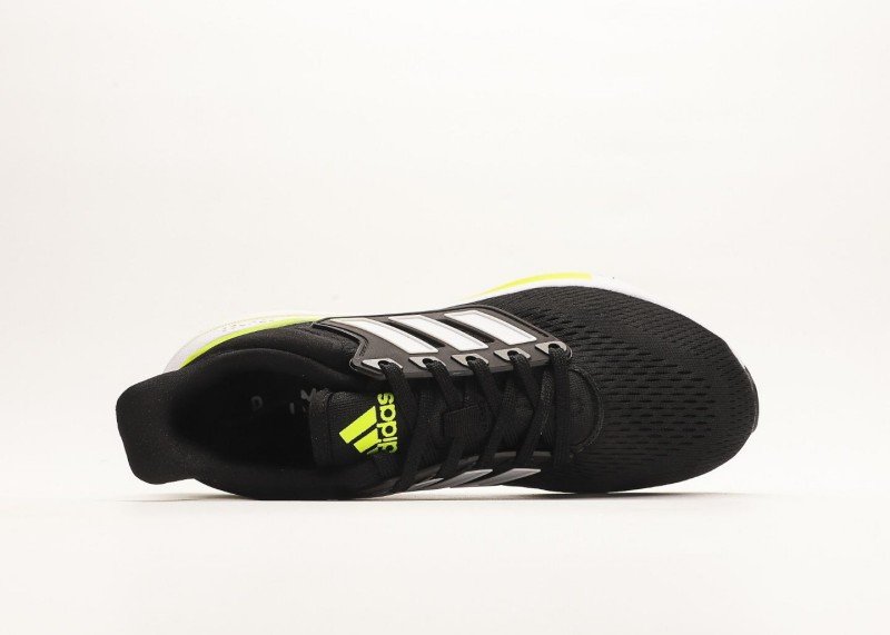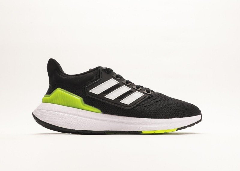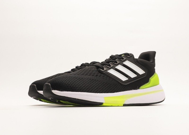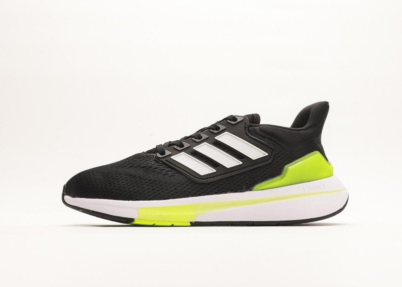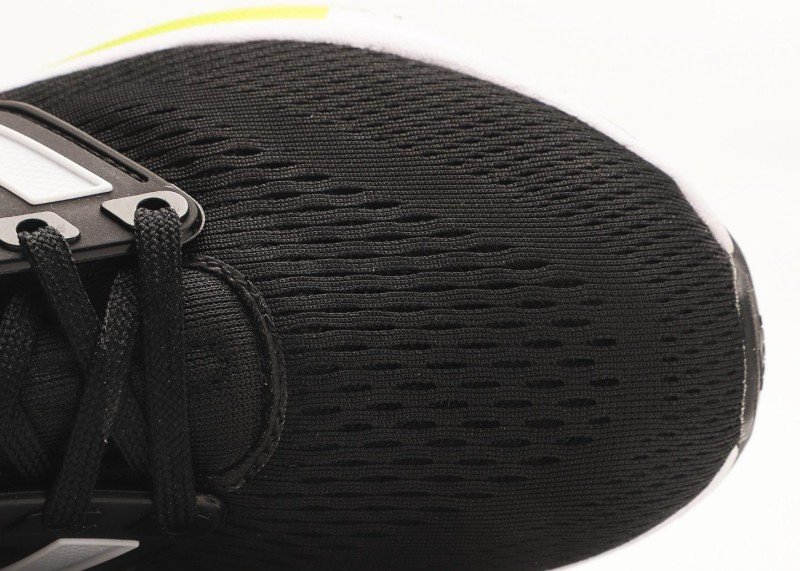 Black mesh upper with white three stripes, bright yellow triangular heel decoration, creating striking color contrast.