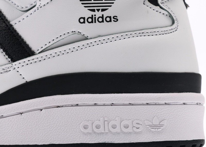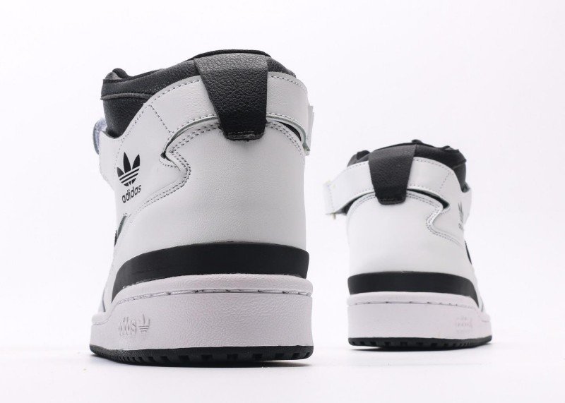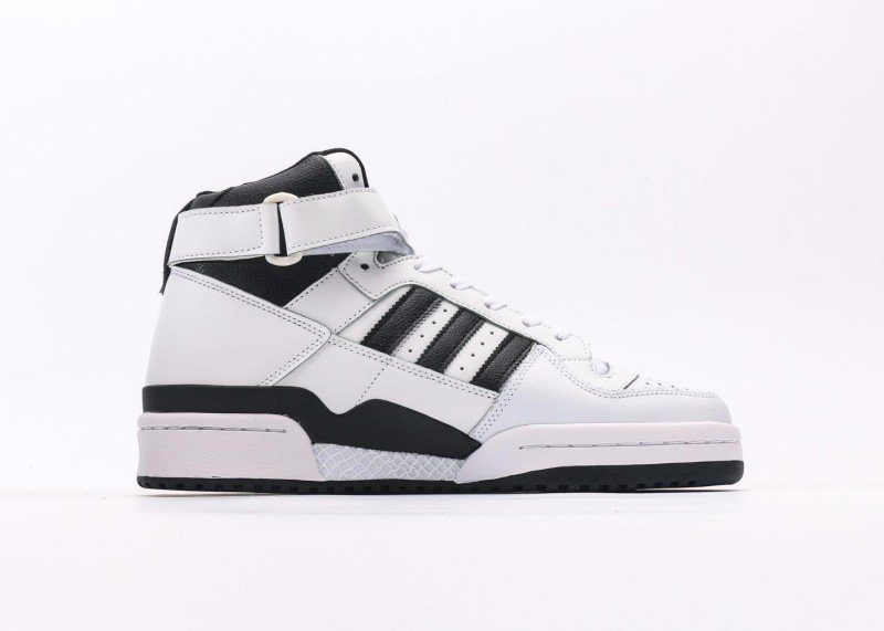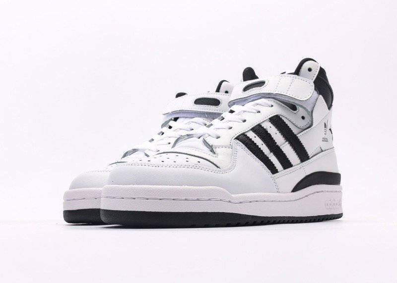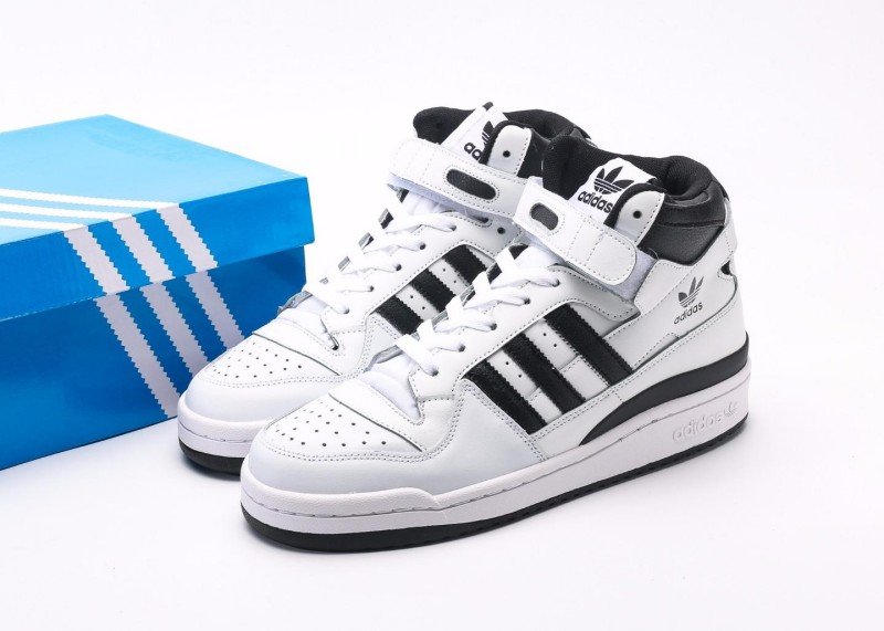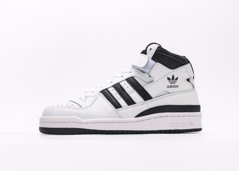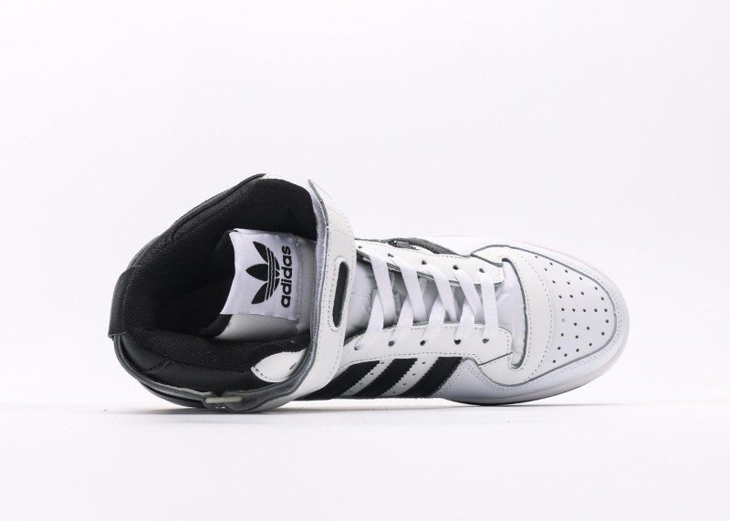 These adidas Trefoil high-top sneakers feature a classic black and white color scheme, showcasing a minimalist and stylish style. The clean, pure white leather upper is accented with black stripes for a sporty, dynamic look.