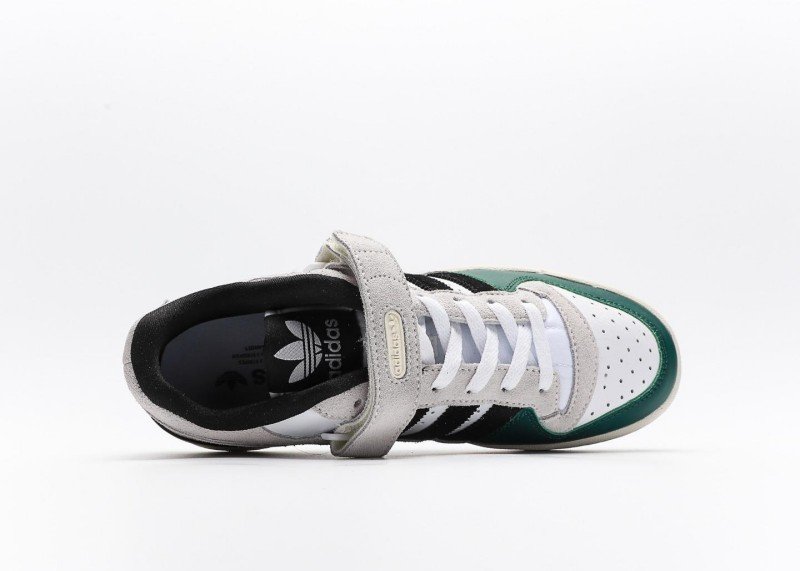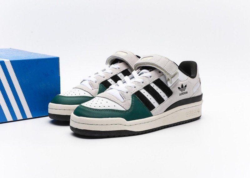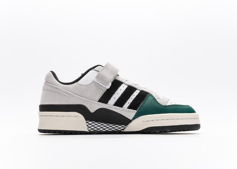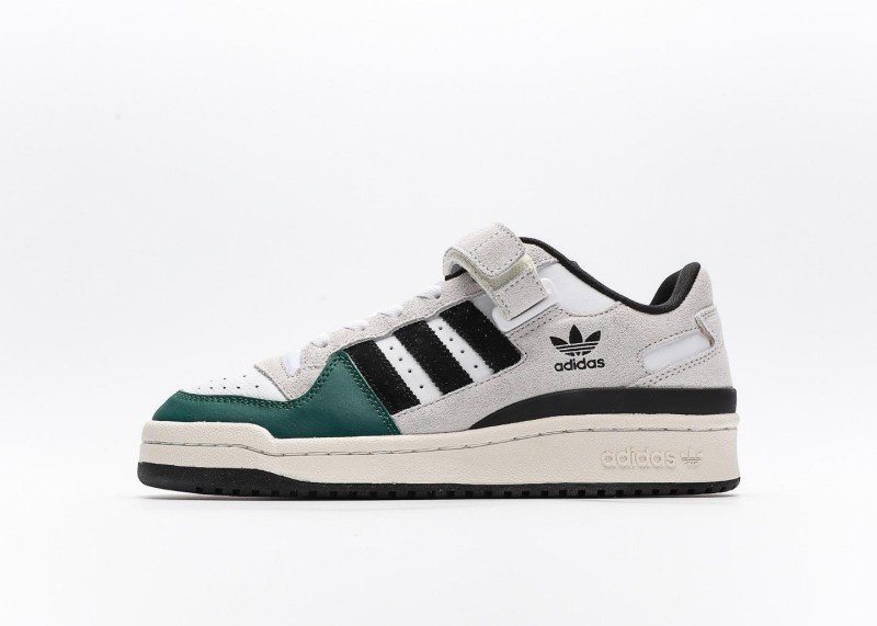 This adidas Trefoil low-top sneaker with dark green and black stripes features a retro, contrasting design. The dark green and white upper features a stylish, elegant design, with black stripes and white interlacing for a layered feel.