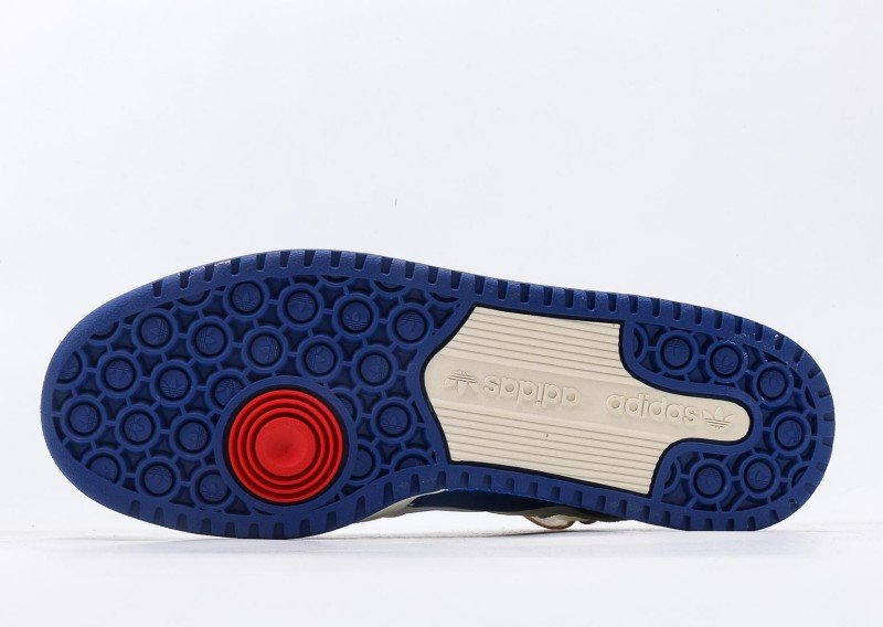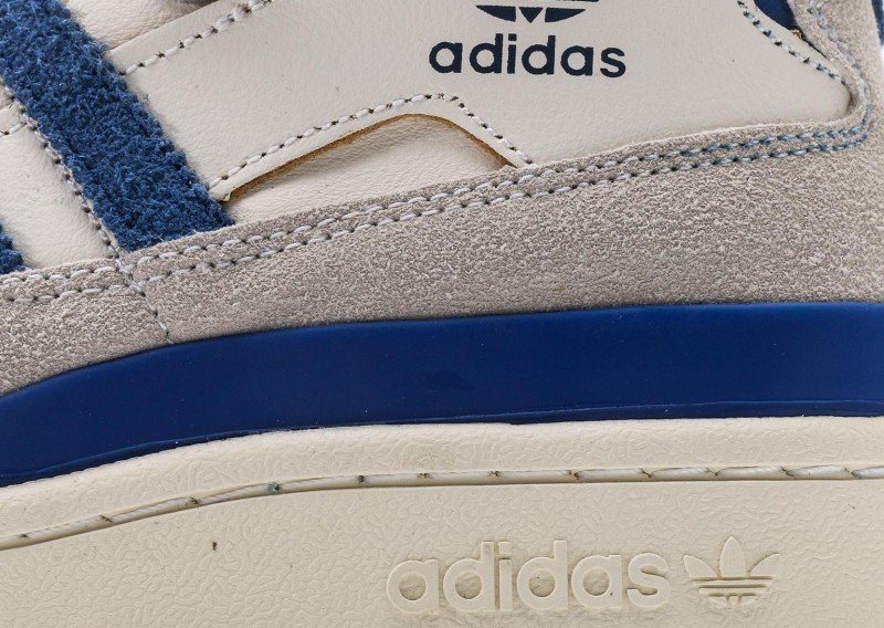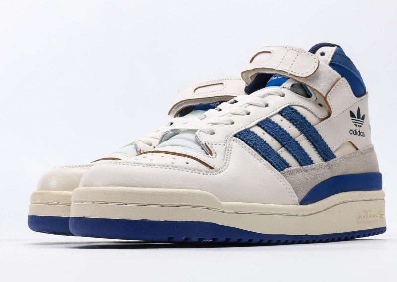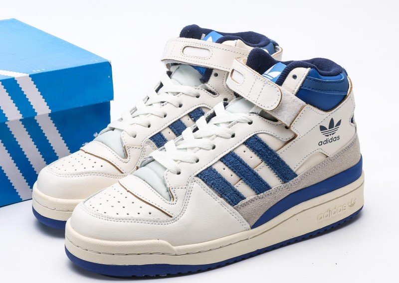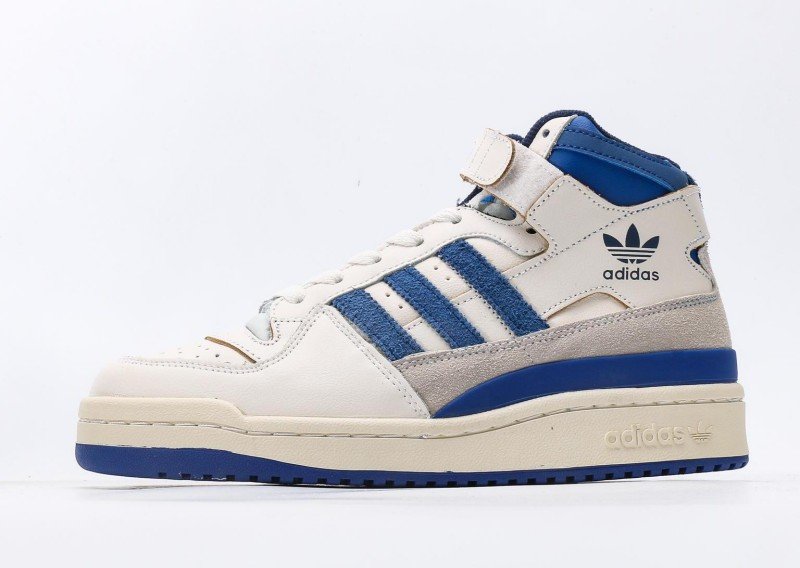 adidas Originals high-top blue-white sneakers feature a cream leather upper with three horizontal blue suede stripes extending from toe to heel, below which a light gray suede panel connects. Navy trim adorns the ankle collar with white inner binding and white velcro strap. Black trefoil logo and “adidas” lettering on the side, paired with a cream sole with navy trim, creating a classic blue-white-gray colorway.