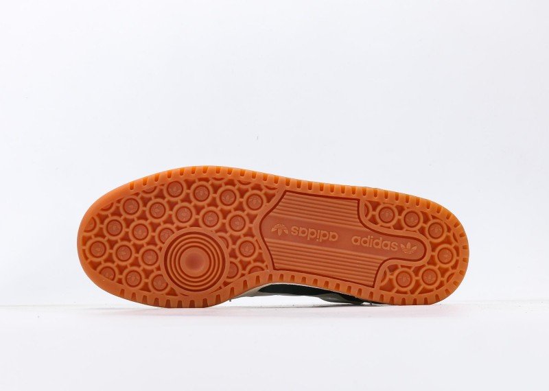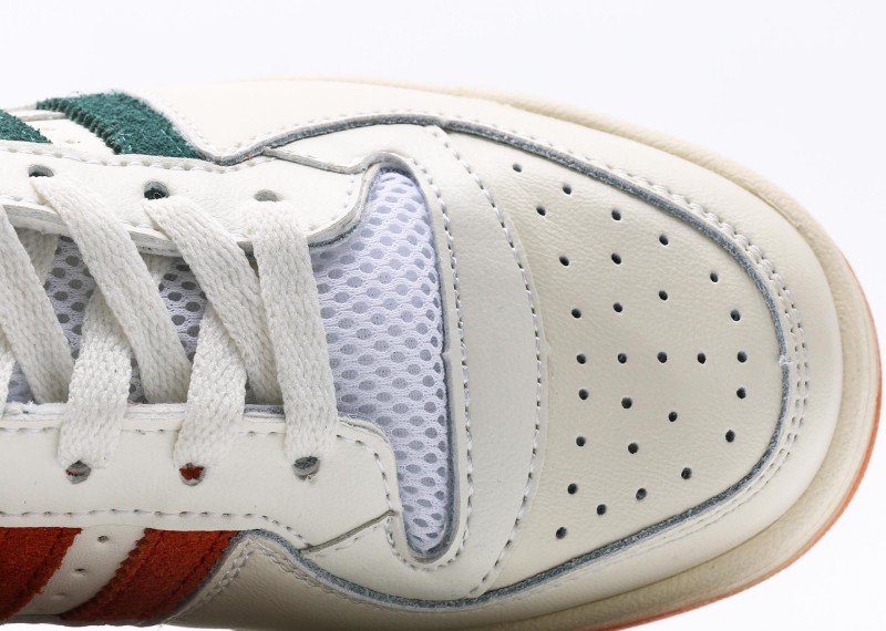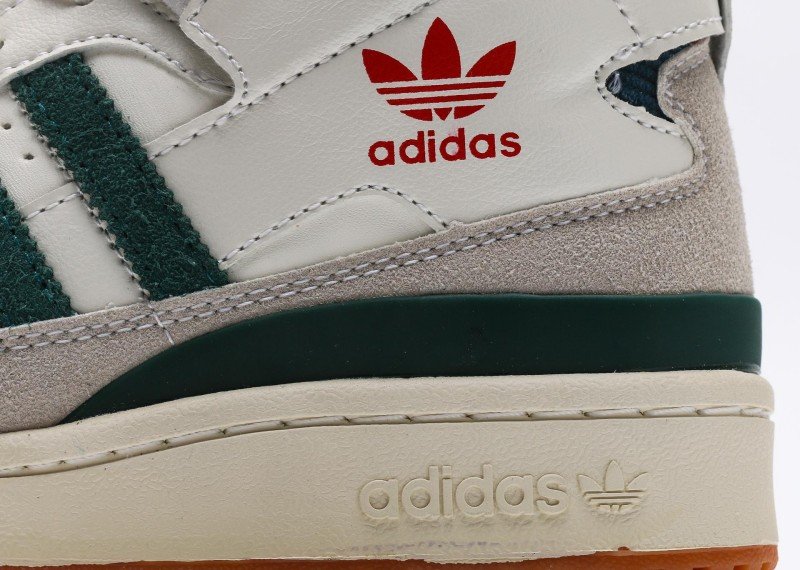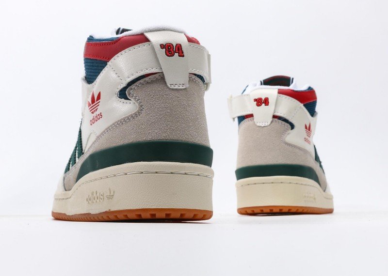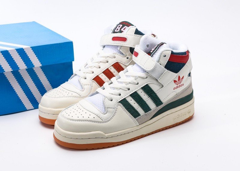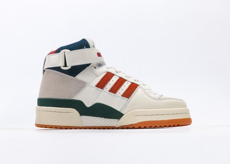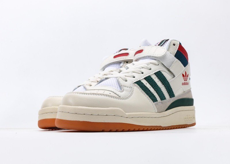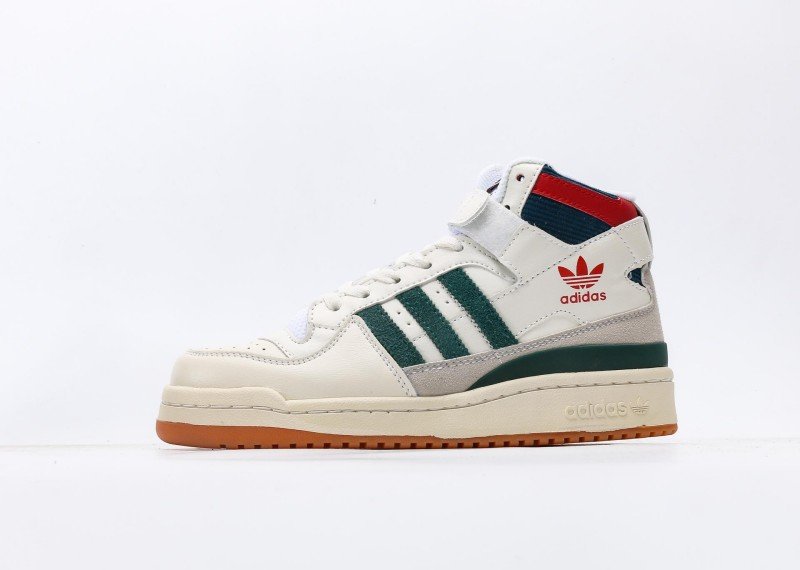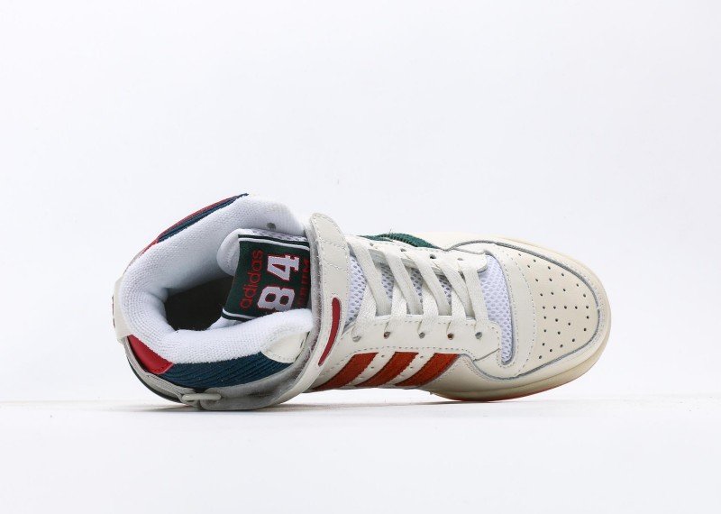 adidas Originals high-top color-block sneakers feature a cream leather upper with three dark green parallel stripes and white stitching. The ankle collar has red and navy blue patchwork fabric for striking color contrast, complemented by a red trefoil logo and “adidas” lettering on the outer side. White velcro strap adds functionality, while the cream midsole with brown rubber outsole offers clear treads and strong grip.