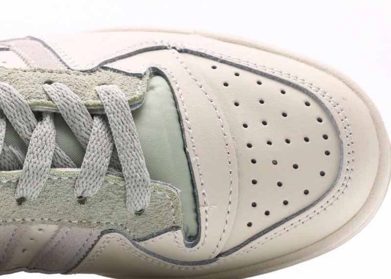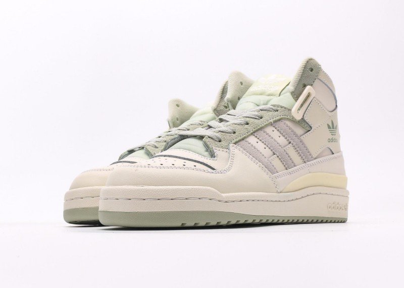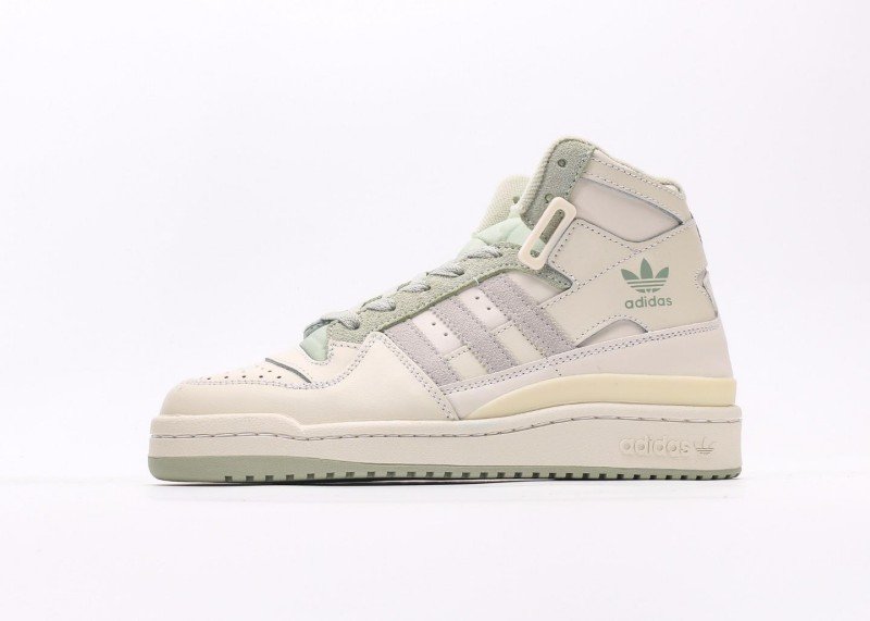 adidas Originals high-top pastel sneakers feature a cream leather upper with three horizontal light gray stripes extending from toe to heel. Light green trefoil logo and “adidas” lettering adorn the side, paired with light gray laces, light green accents on the tongue top and heel, and a beige square buckle for a minimalist fresh look. Cream sole with light gray trim creates a soft, unified color palette.