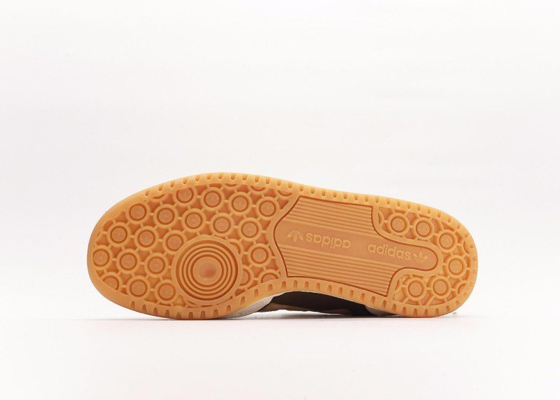 A black Trefoil logo on the side of the shoe highlights the brand’s identity. Mesh perforations on the sides enhance ventilation. The off-white midsole and brown rubber outsole provide excellent traction and a vintage feel.