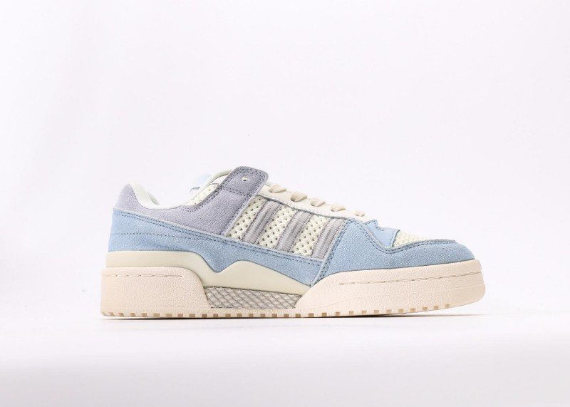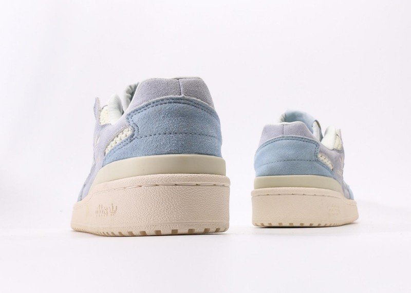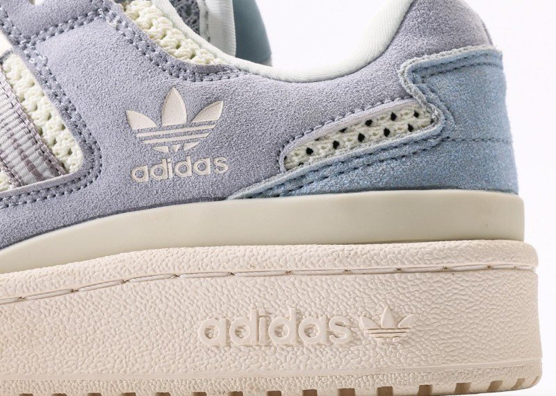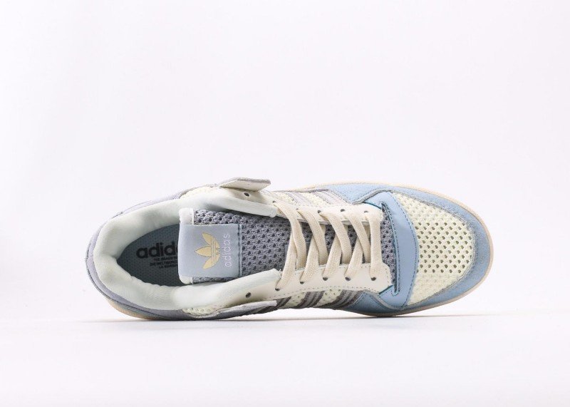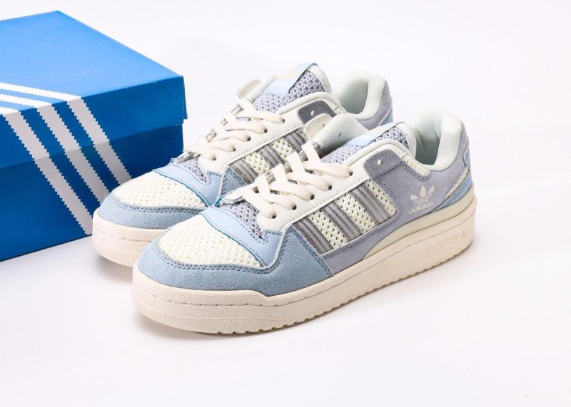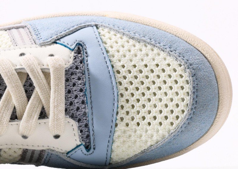 This adidas Originals sneaker features a blue-gray-cream patchwork upper, light blue suede toe cap and heel, three gray stripes on the side, cream laces, and a cream thick rubber sole, presenting a minimalist and retro casual design.