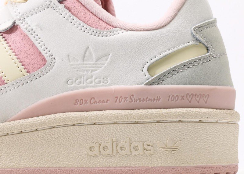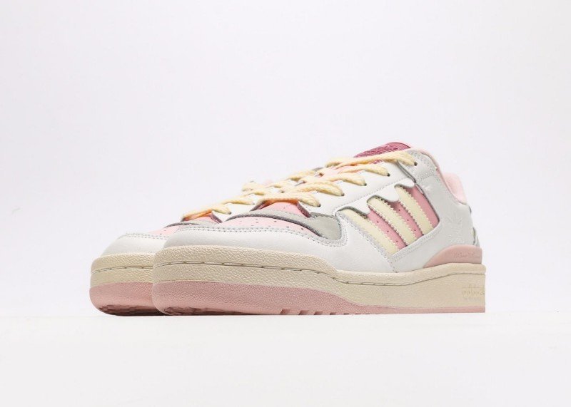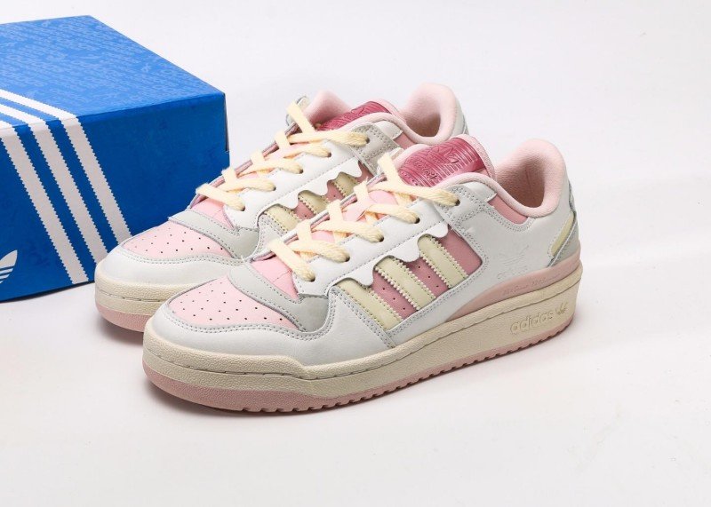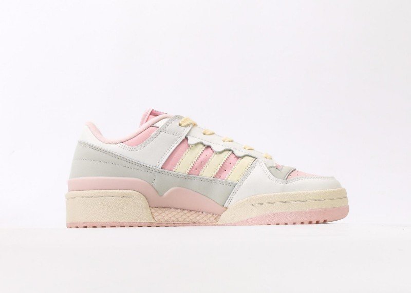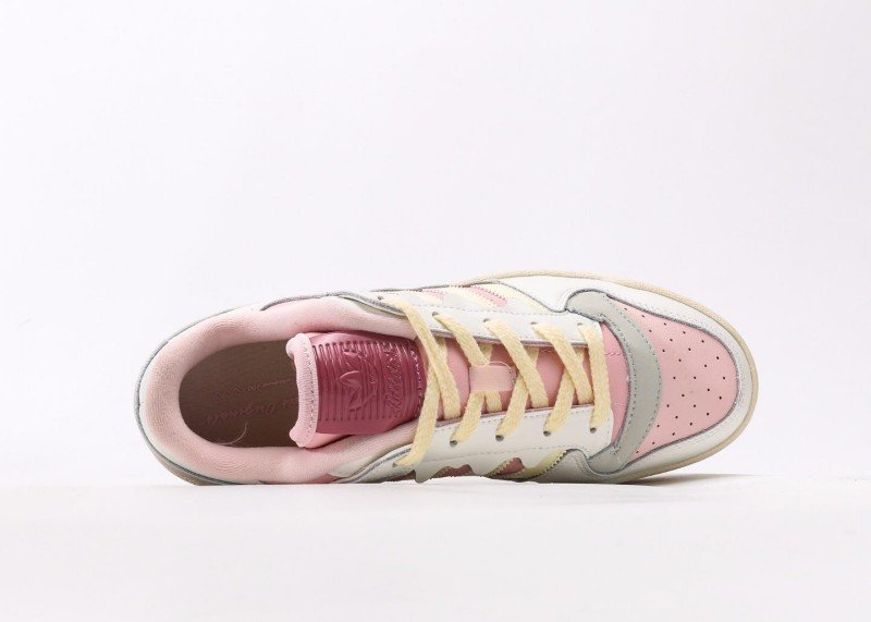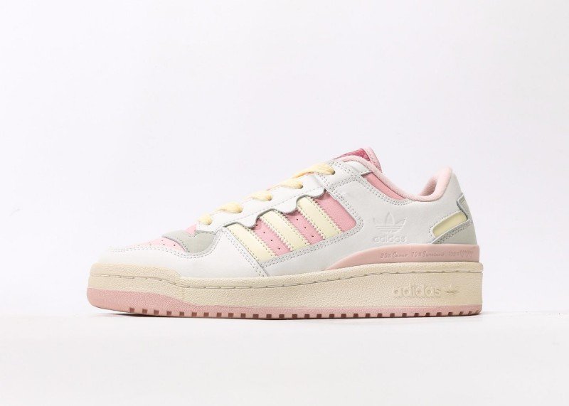 This adidas Originals sneaker features a pink-yellow-white patchwork upper, three alternating pink and yellow stripes on the side, pink heel accent, yellow laces, and a cream rubber sole with black trefoil logo, presenting a sweet and retro casual design.