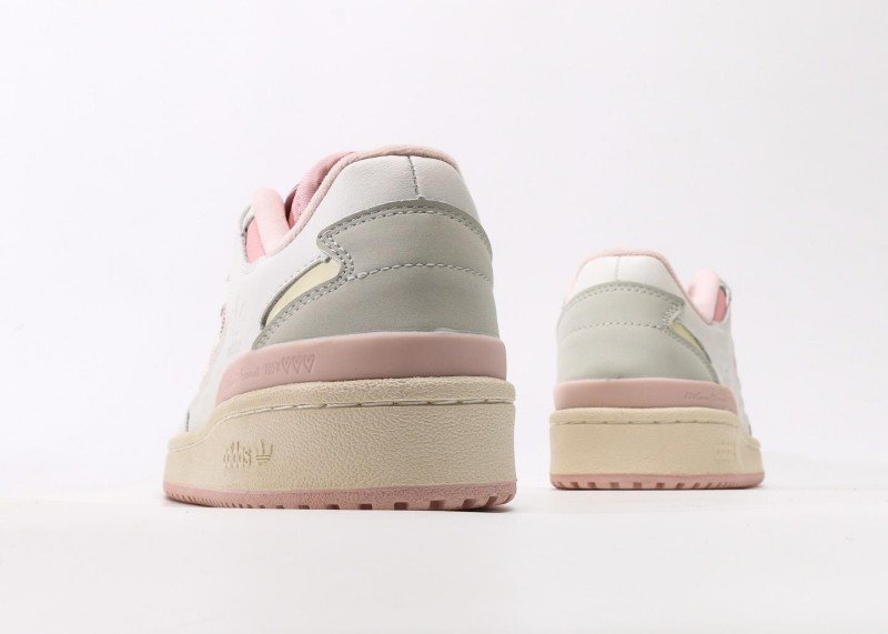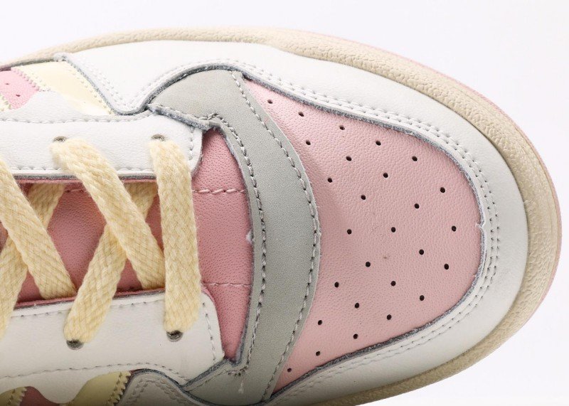 A: Upper combines leather and fabric in pink-yellow-white colors, with breathable holes for balanced texture and comfort.