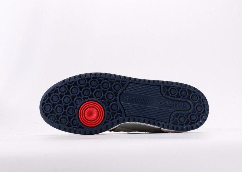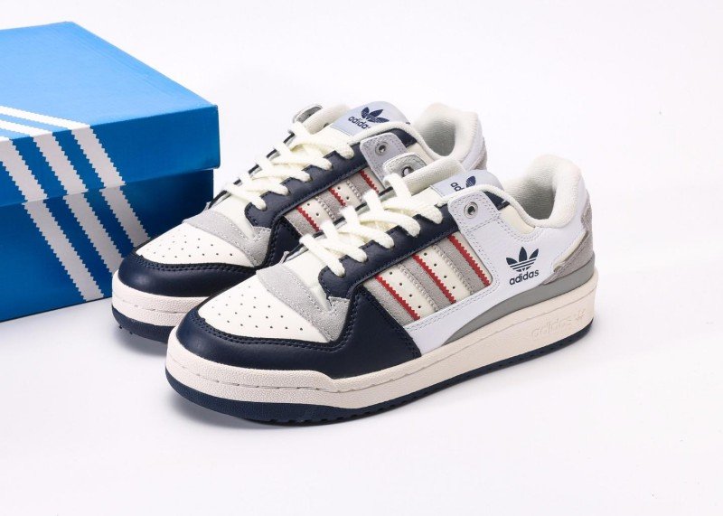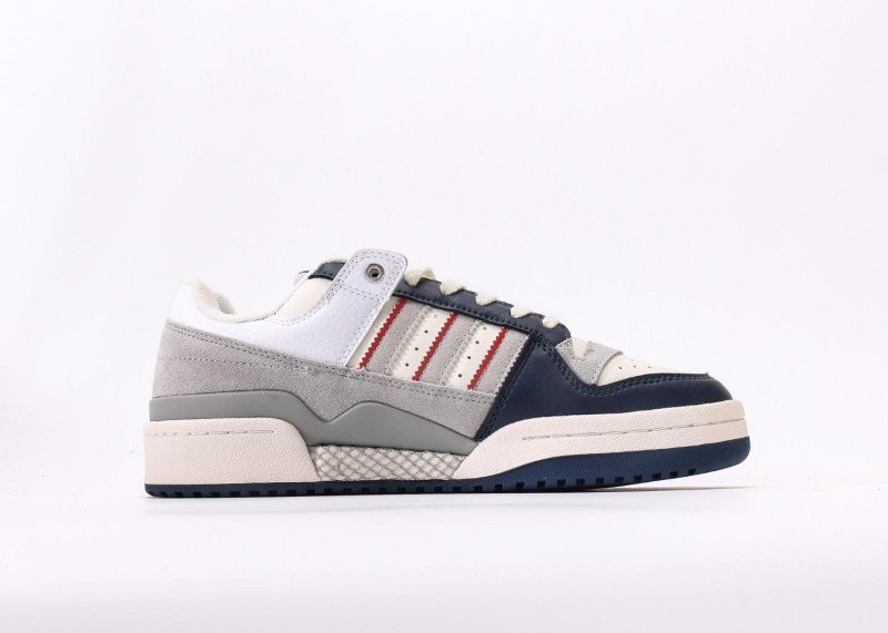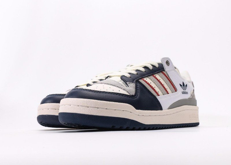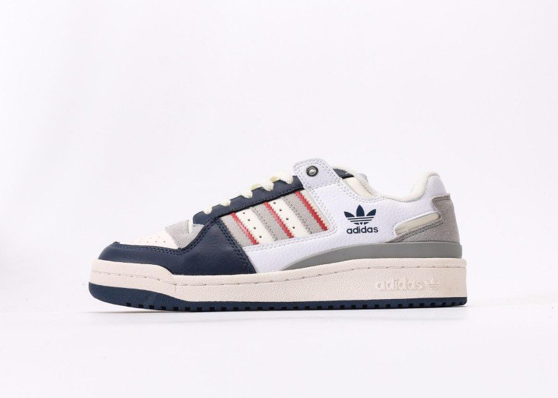 This adidas Originals sneaker features a blue-white-gray-red patchwork upper, classic three parallel stripes (gray base with red细纹) on the side, white leather toe cap, dark blue heel accent, and a cream thick rubber sole, presenting a classic retro design with brand标志性 style.