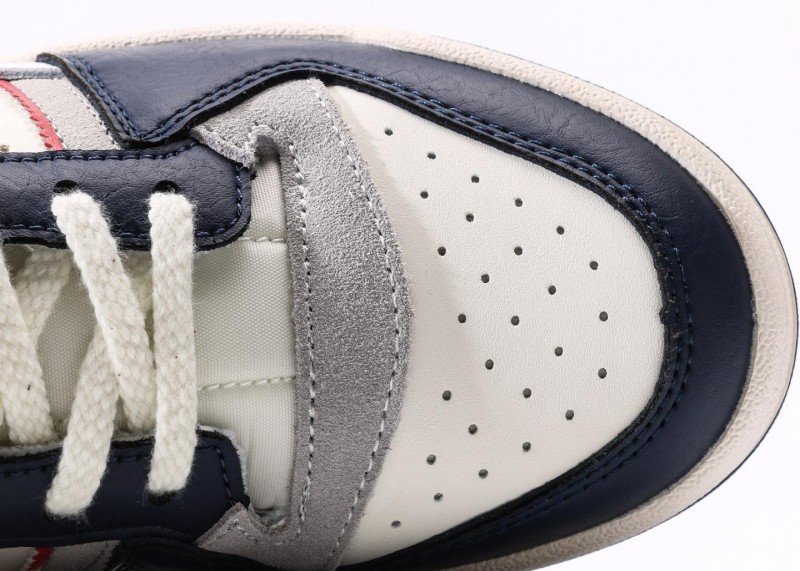 A: Upper combines fabric and leather patchwork in blue-white-gray-red, with breathable holes for durability and comfort.