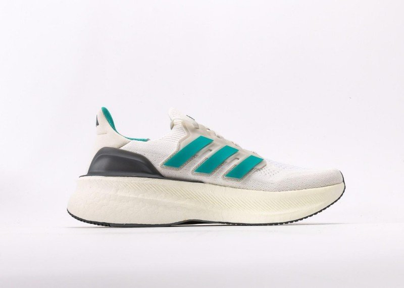 This adidas ULTRABOOST LIGHT white-green stripe sports shoe features a pure white base, with three teal parallel stripes extending from the toe to the heel, perfectly blending classic design with modern technology.