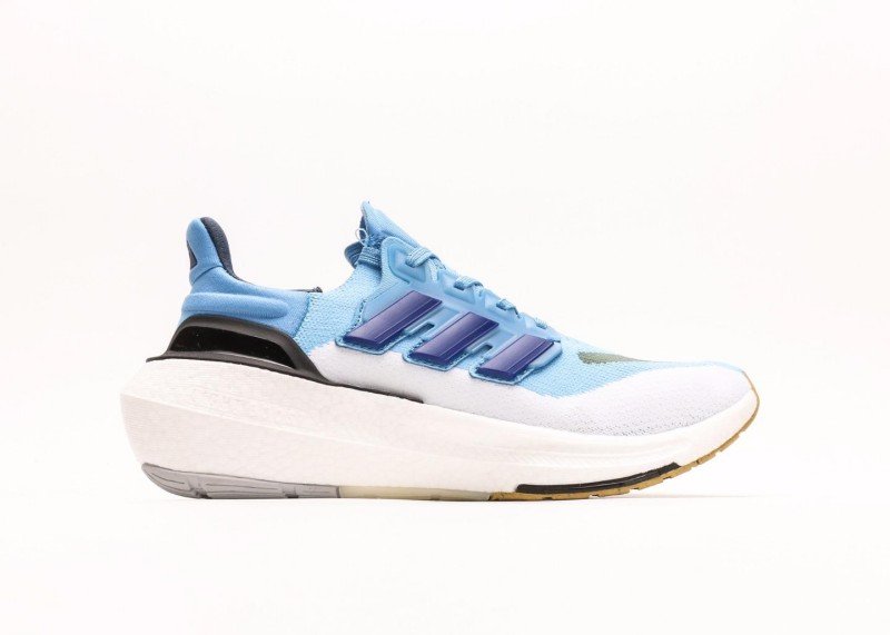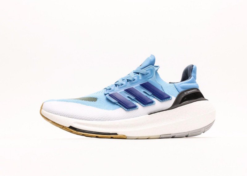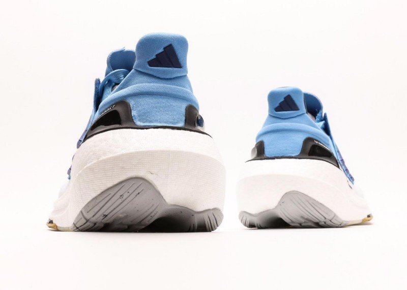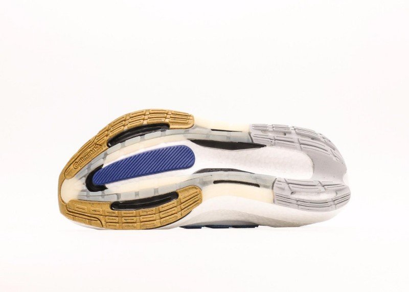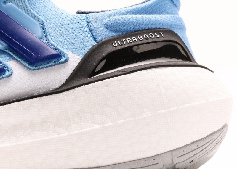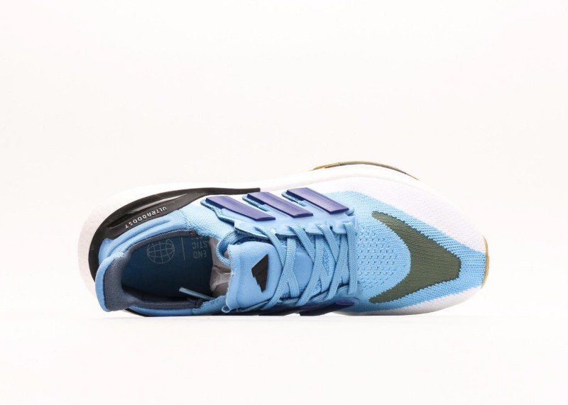 Three dark blue parallel stripes extend from toe to heel, black area below stripes printed with white “ULTRABOOST” lettering. Black stabilizer on the outside of the heel, white midsole with light brown rubber outsole, clear anti-Slip texture.
