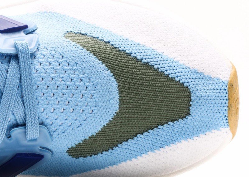 The toe uses white mesh breathable material, fine holes accelerating air circulation. Light blue fabric texture in midfoot enhances upper support, lightweight and fit, suitable for long-time sports.