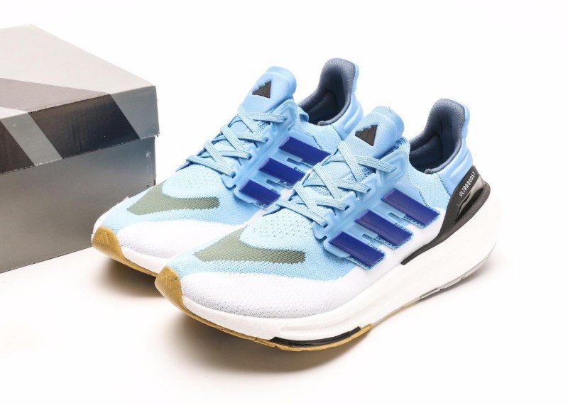 adidas ULTRABOOST Light Blue-White Stripe Sports Shoes feature light blue main tone with white toe and dark blue stripes, ULTRABOOST series classic design upgraded, showing fresh and energetic sports style.