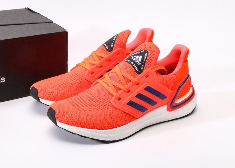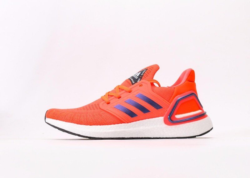This adidas ULTRABOOST orange sports shoe features high-quality woven mesh material, lightweight and breathable, designed for running and daily casual wear. Three parallel dark blue stripes on the side, outlined in white, create a striking visual contrast that highlights the brand’s iconic style.