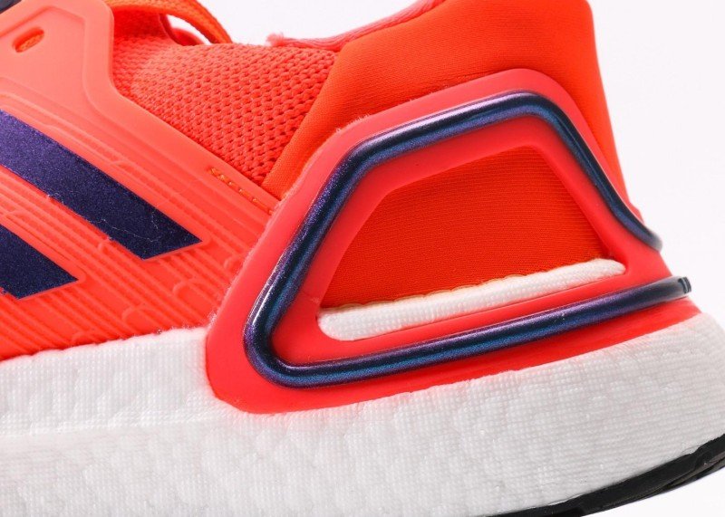 The laces match the upper color, passing through orange eyelets with natural droop ends, enhancing overall coordination. A black label on the tongue top features the white “adidas” logo and “ULTRABOOST” wording, emphasizing brand identity and product line.