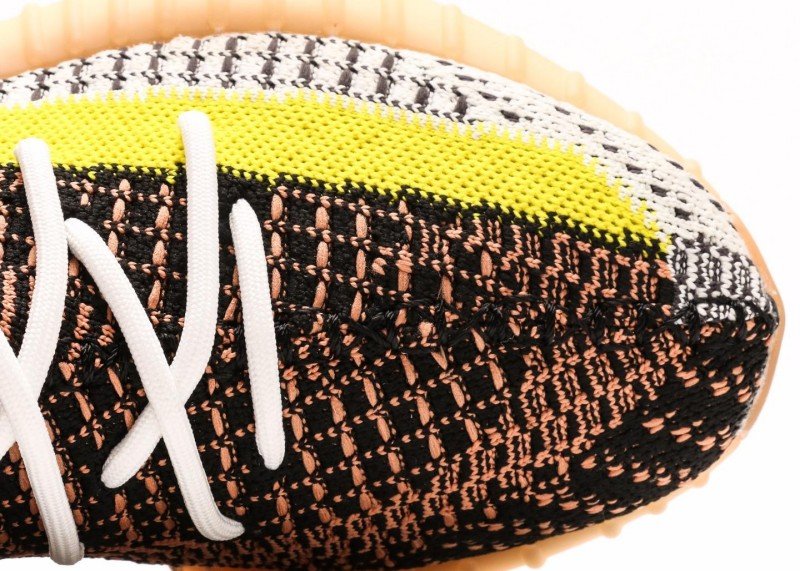 Q: What is the upper material of adidas Yeezy Boost 350 V2 brown-yellow patchwork stripe sneakers?