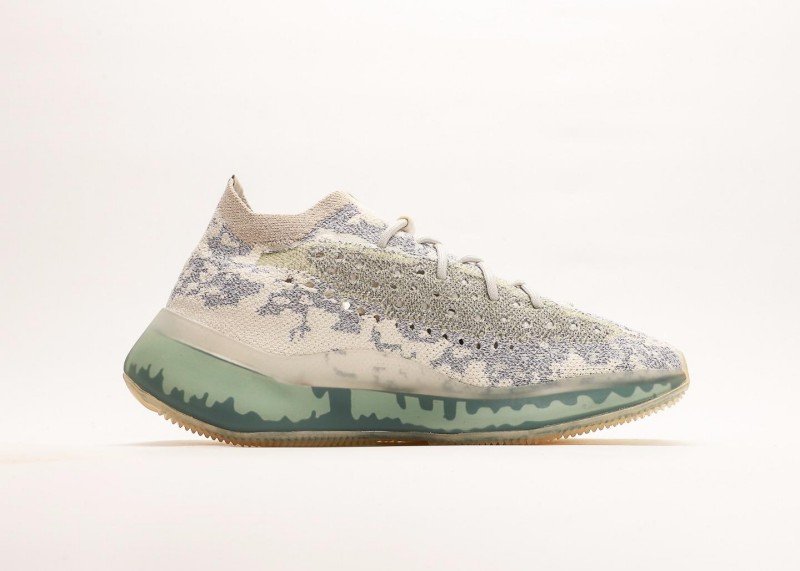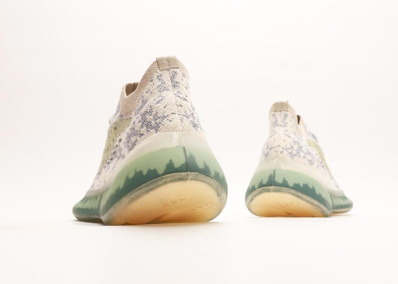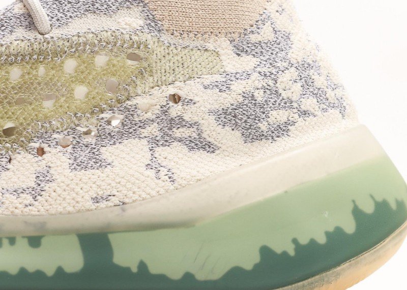 Upper with beige base, breathable knitted mesh material, covered with gray-blue and green speckled texture, presenting a camouflage-like visual effect, fashionable and unique.
