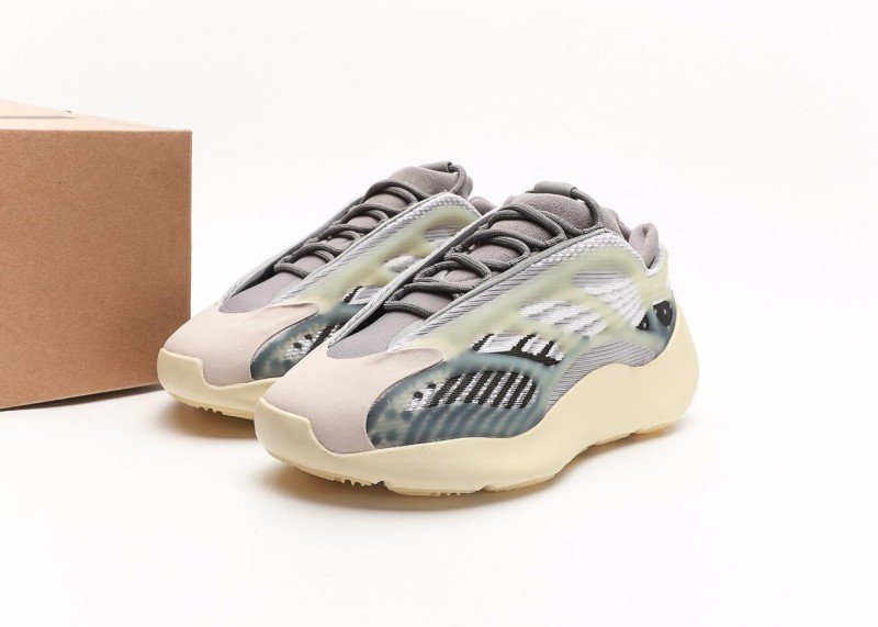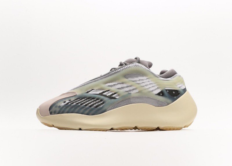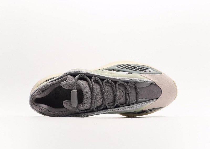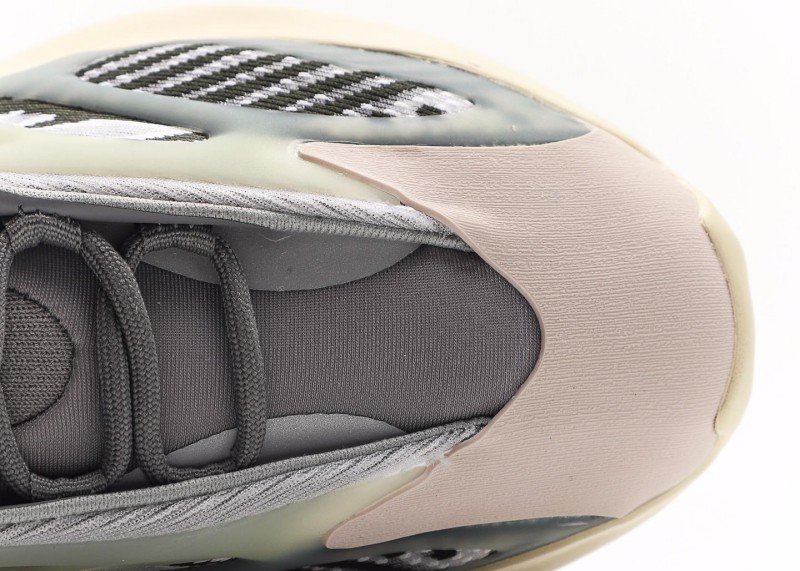 The shoe body is mainly gray, with dark gray and white woven textures, presenting regular stripes. The unique wavy layered design in the middle enhances visual three-dimensionality. Light gray rounded toe, dark gray flat laces tied in a natural bow, exquisite details.