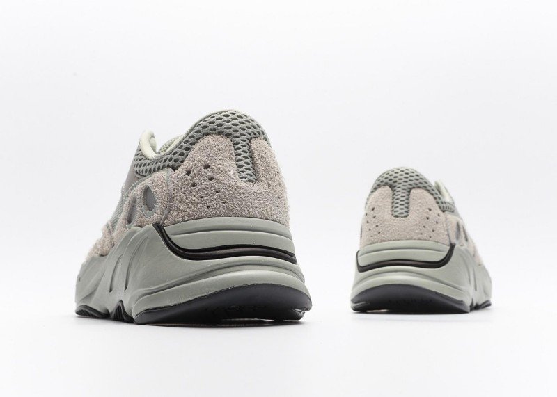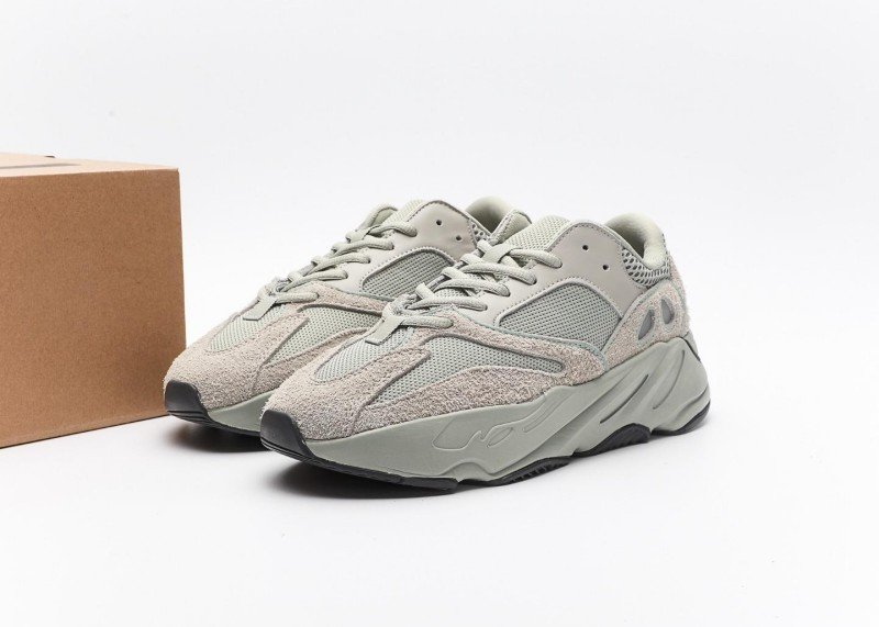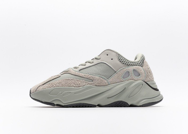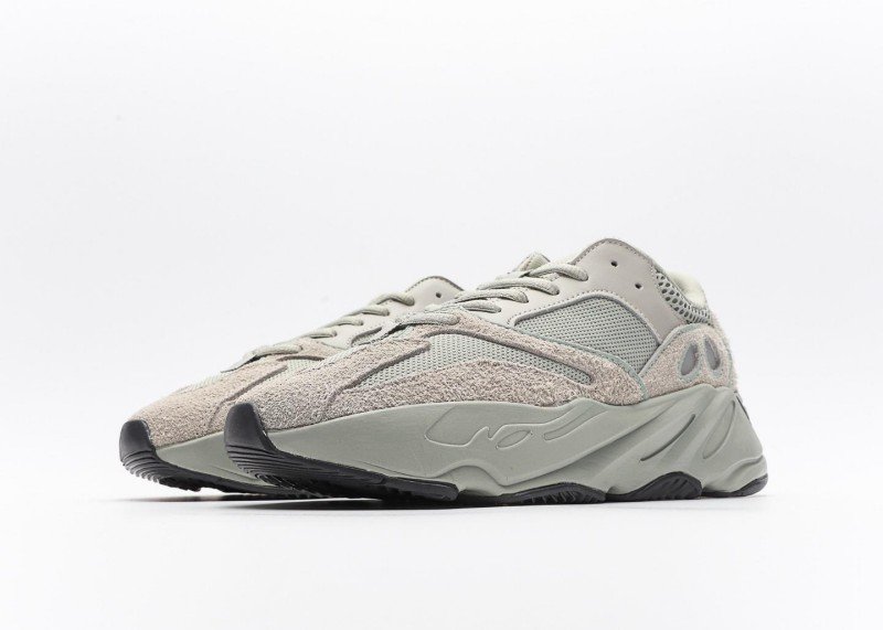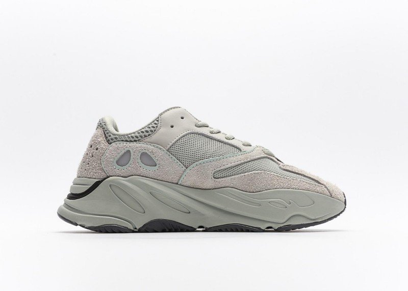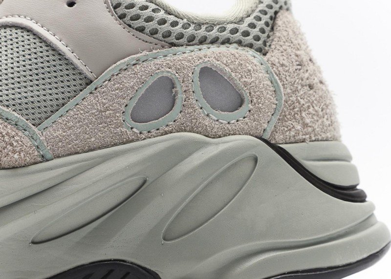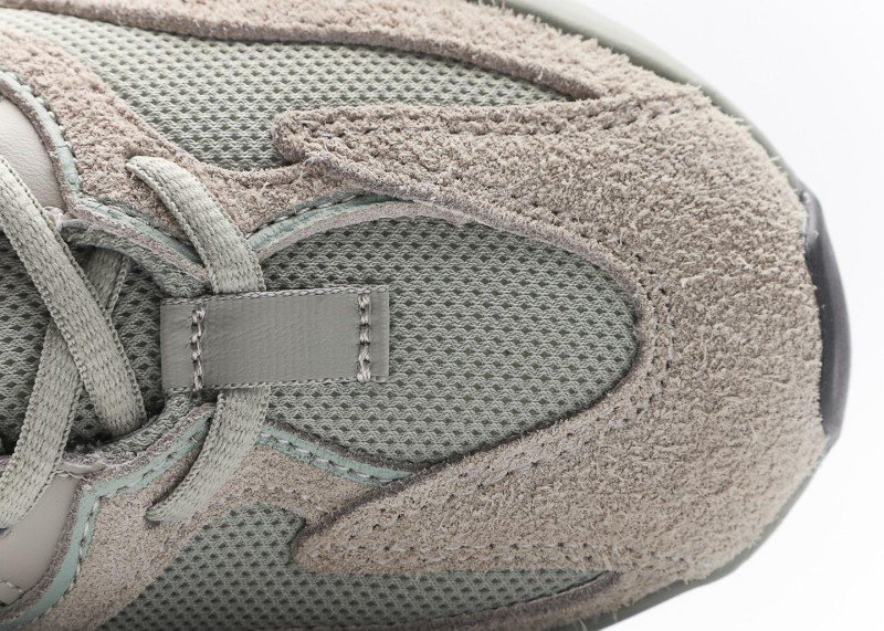 Upper mainly light gray, toe and midsection with light beige suede, side panels and tongue in light gray mesh. Three oval cutouts on side enhance design and breathability.