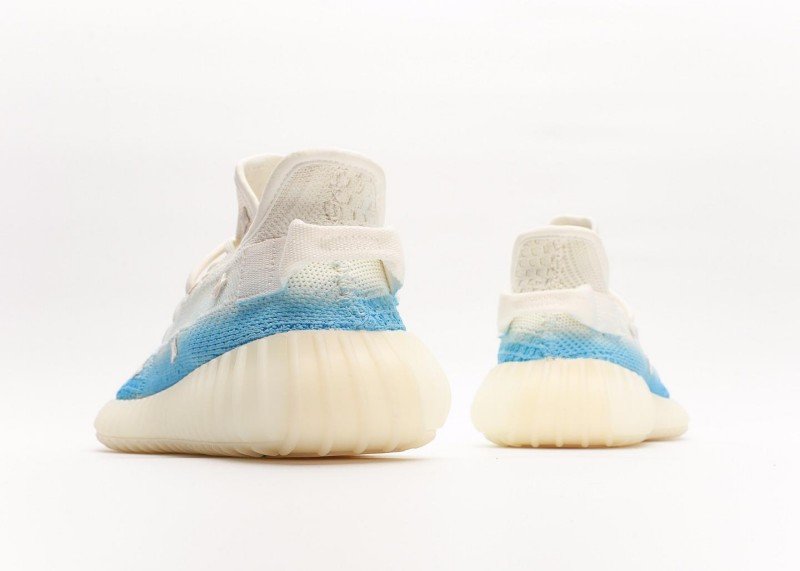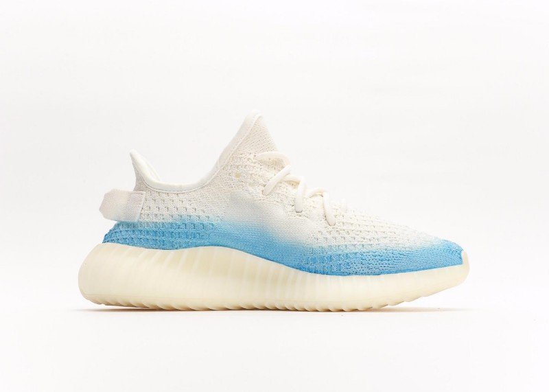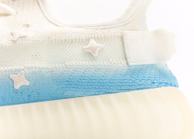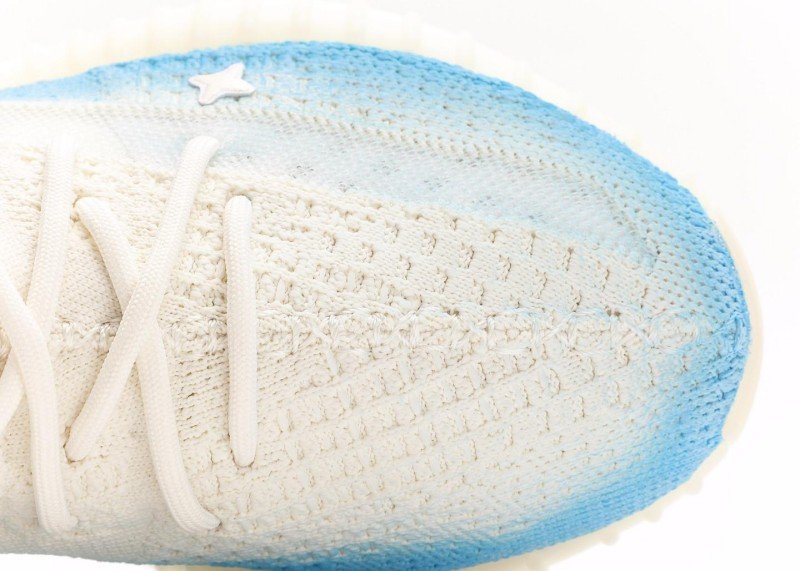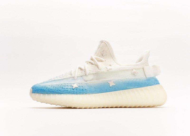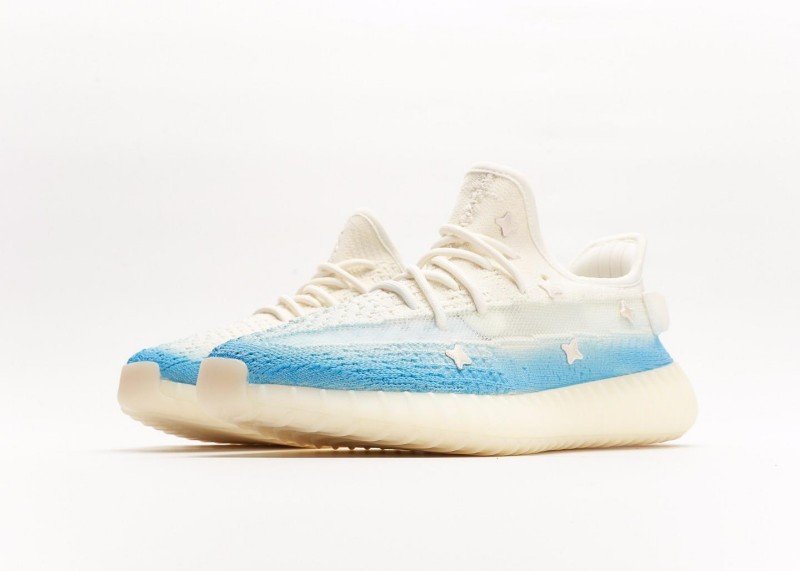 This adidas Yeezy Boost 350 V2 sneaker features a white-to-blue gradient knit upper with multiple white star patterns, white laces, and a cream rubber sole with wavy纹路, presenting a fresh and playful design.