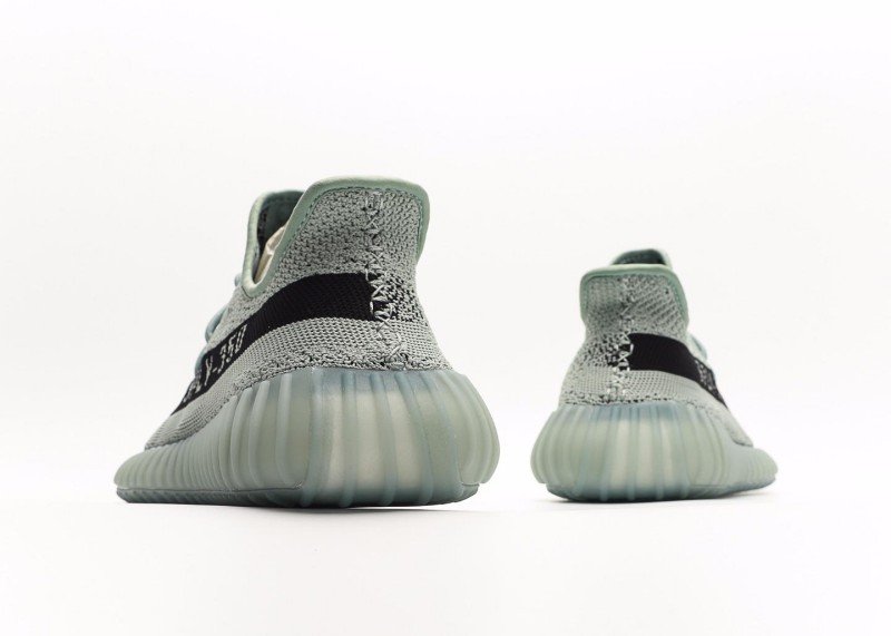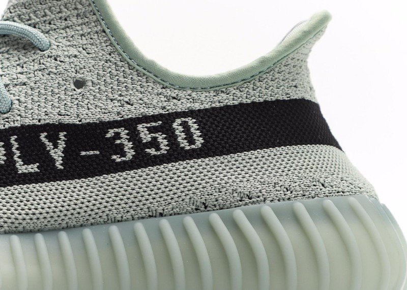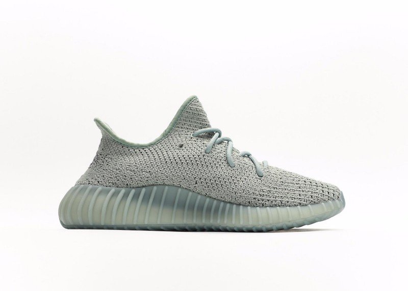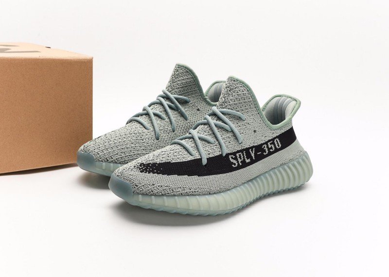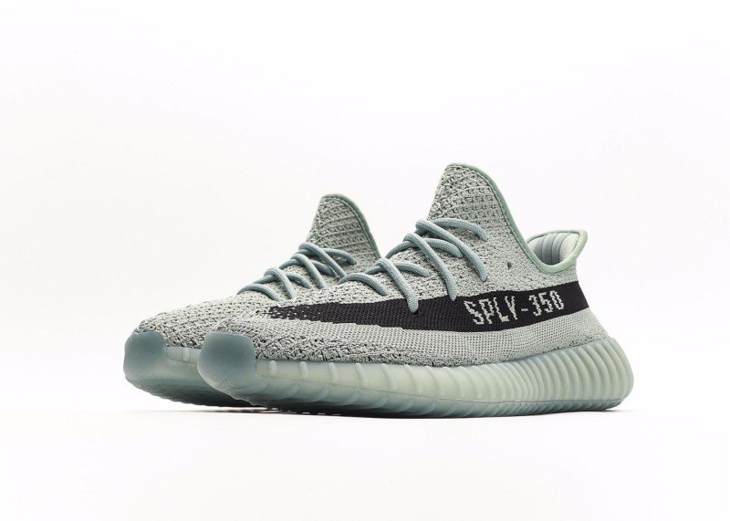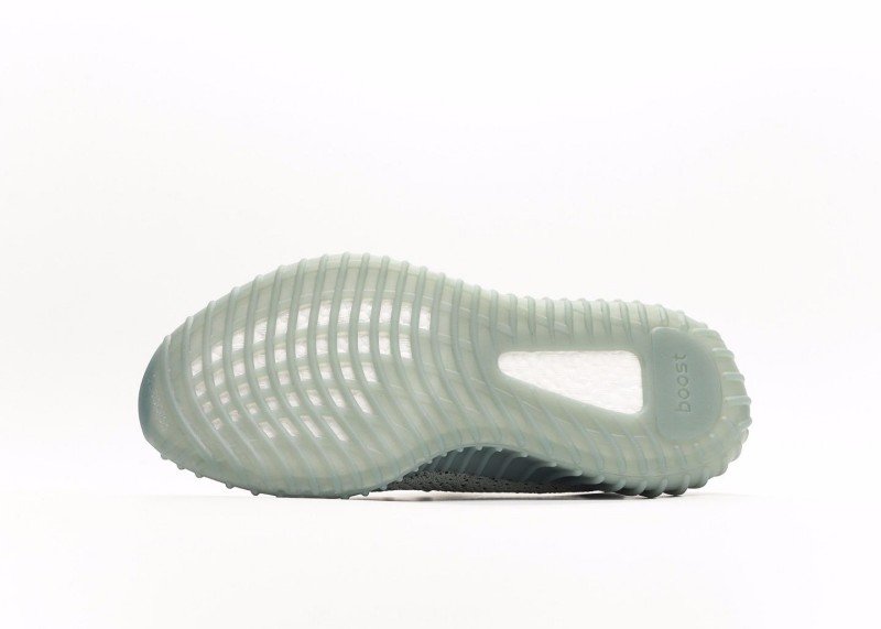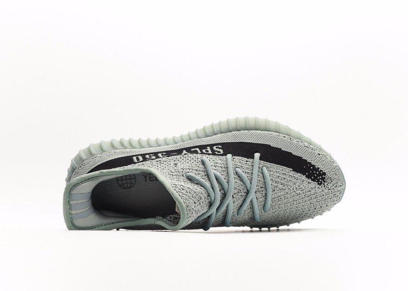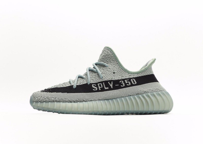 This adidas Yeezy Boost 350 V2 sneaker features a light gray knit upper with fine texture, a horizontal black stripe with white “SPLY-350” lettering, matching gray laces, and a translucent light green sole with wavy纹路, presenting a minimalist and tech-inspired design.