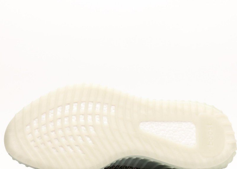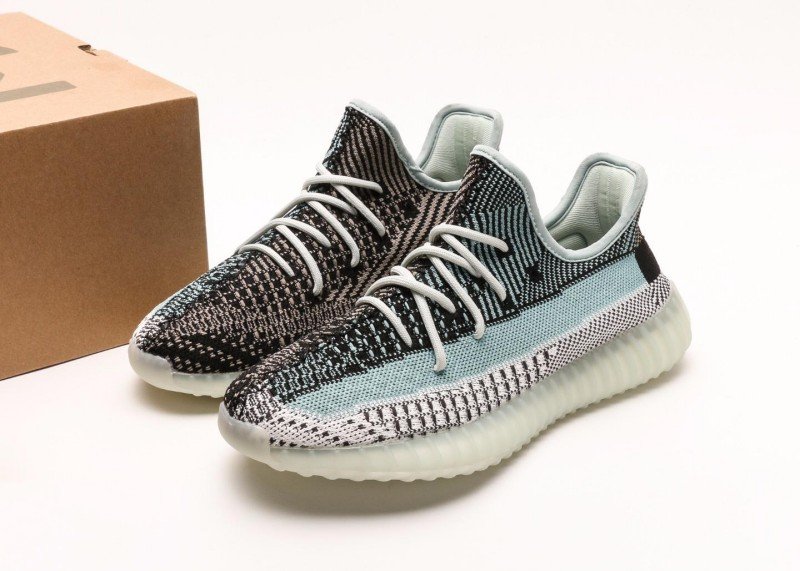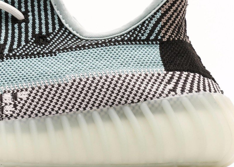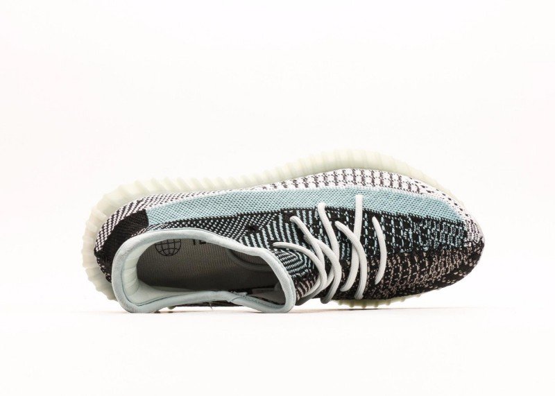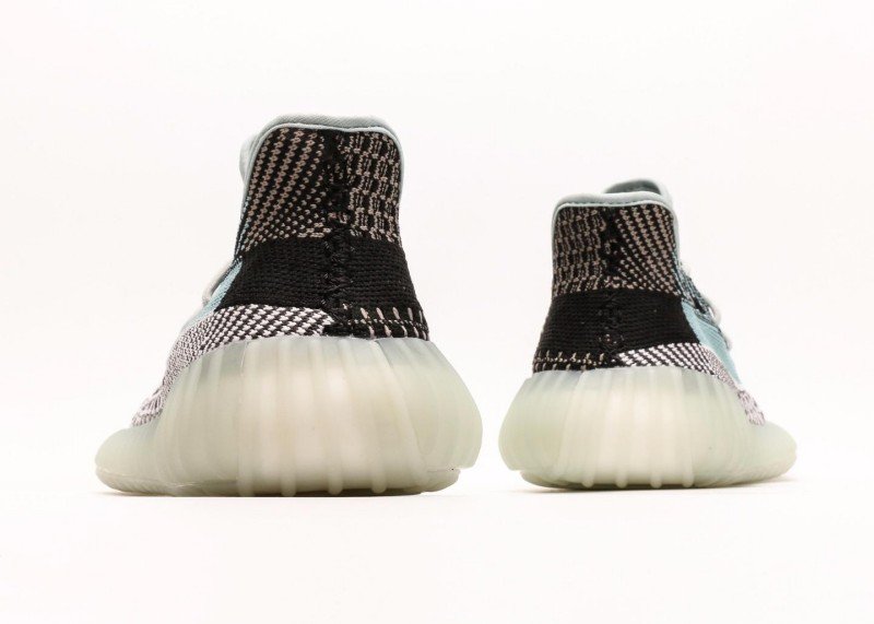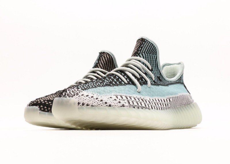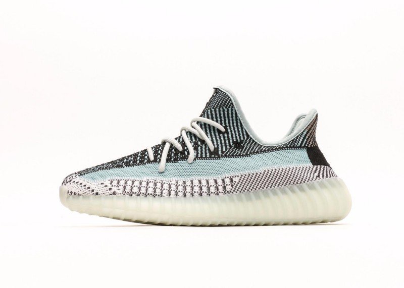 This adidas Yeezy Boost 350 V2 sneaker features a gradient patchwork of black, white, and light blue knit materials with fine regular texture, light grey laces, and a translucent milky white sole, presenting a简约 and tech-inspired design.