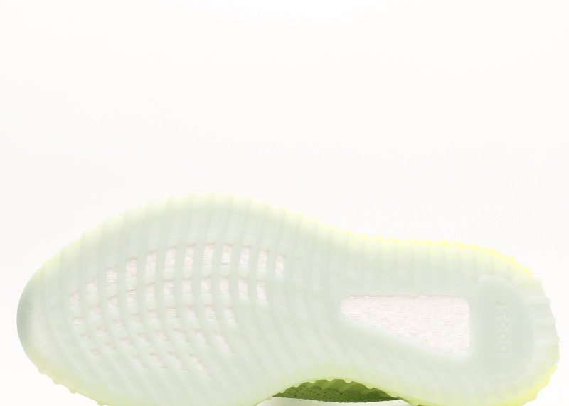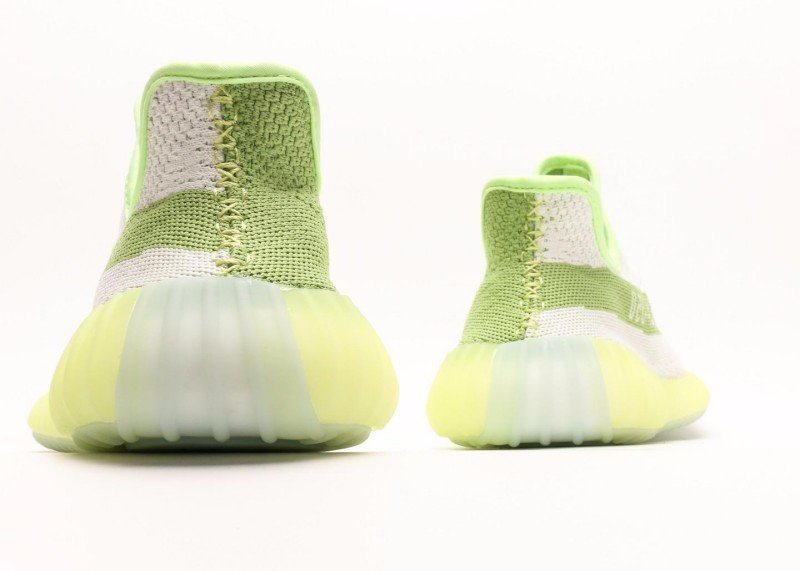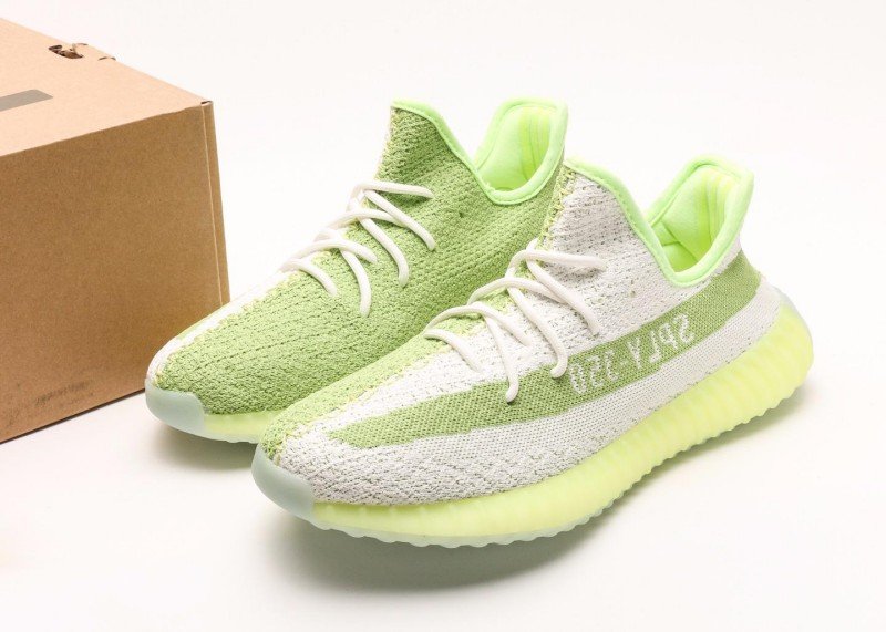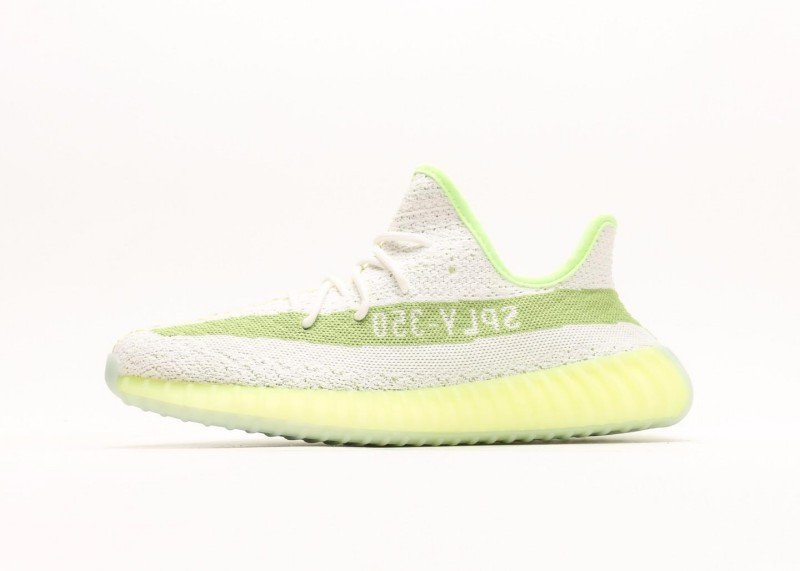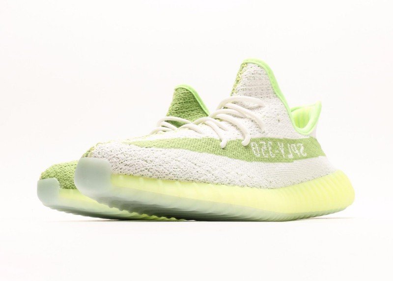 adidas Yeezy Boost 350 V2 White-Green Striped Sneakers, trendy model.