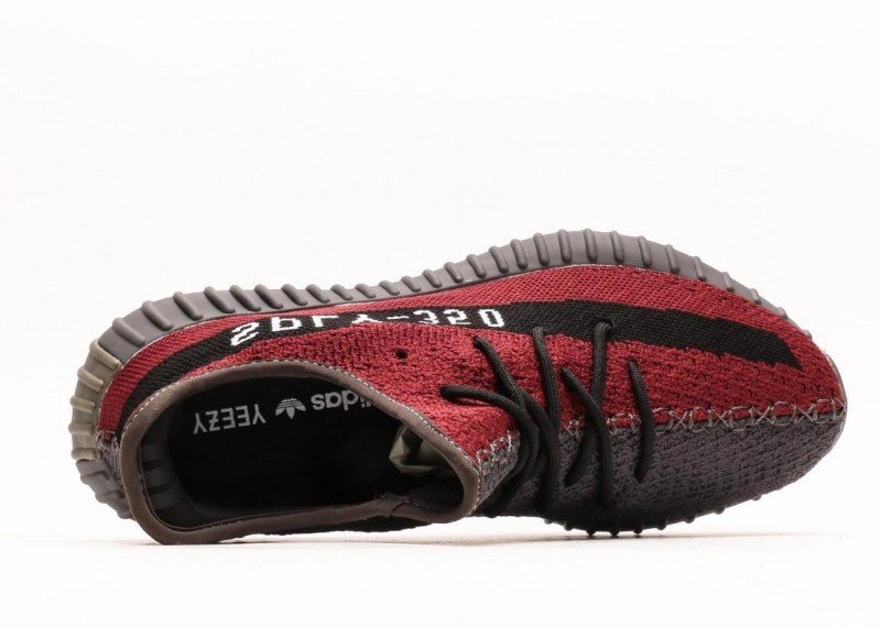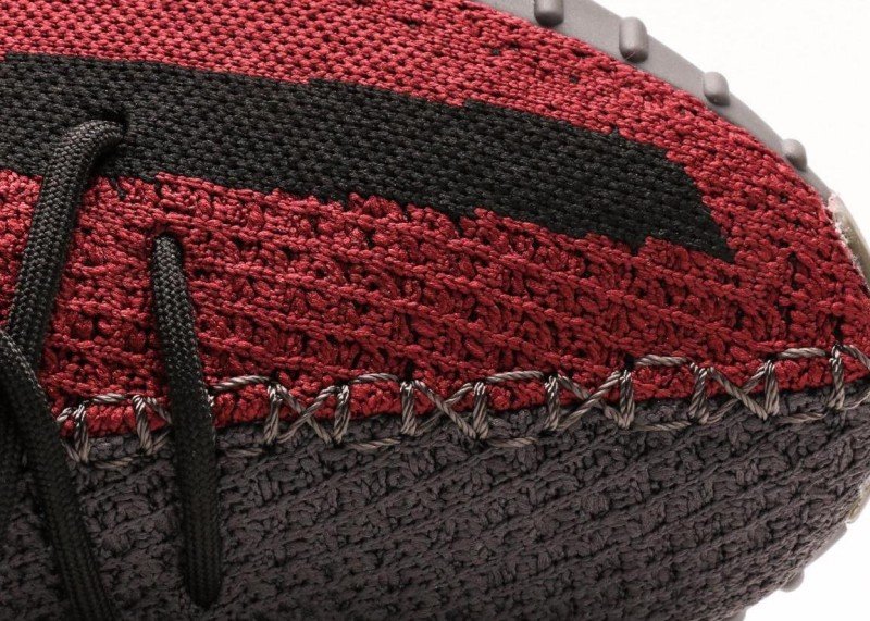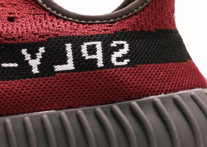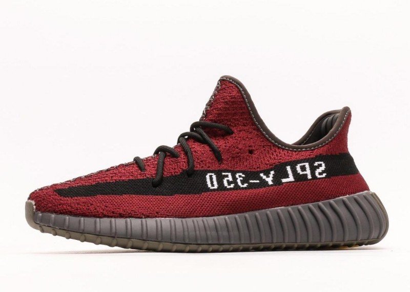 This adidas Yeezy Boost 350 V2 sneaker features a crimson knit upper with fine texture, a horizontal black stripe with white “SPLY-350” lettering, black laces, and a dark gray rubber sole with obvious horizontal wavy patterns, presenting a stylish and sporty design.