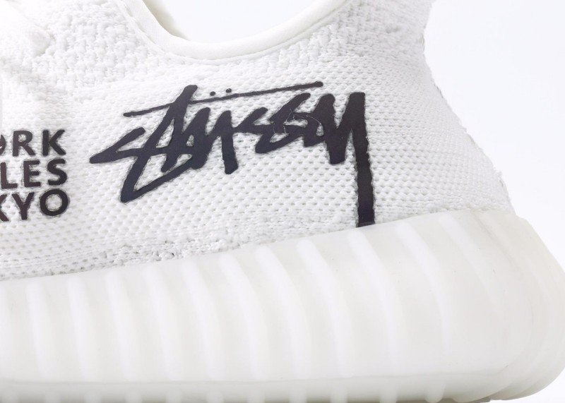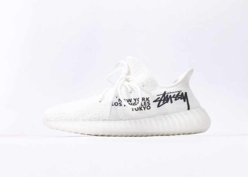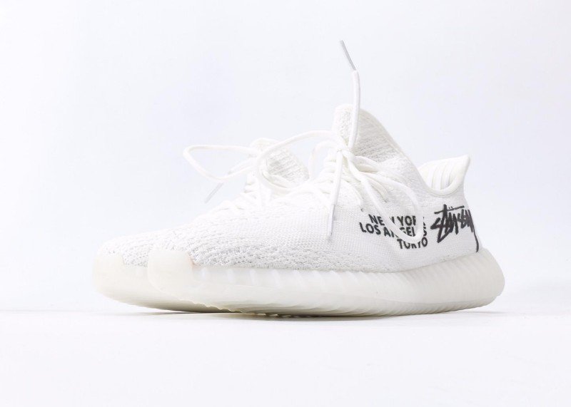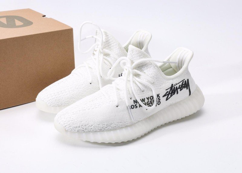This adidas Yeezy Boost 350 V2 sneaker features a pure white knit upper with fine texture and breathable holes, pure white laces, black “NEW YORK”, “LOS ANGELES”, “TOKYO” city name text on the side, a black handwritten “STANSON” signature on the right, and a translucent white sole with obvious horizontal wavy patterns, presenting a简约时尚 overall look.