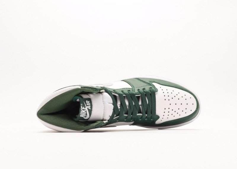 Air Jordan 1 High Sneaker features green-white-silver color scheme, reinventing retro elegant style. Dark green leather upper paired with white mid-panel, accented by silver Swoosh logo, white midsole transitioning harmoniously with dark green outsole, showcasing perfect fusion of sophistication and fashion, suitable for quality-conscious individuals.