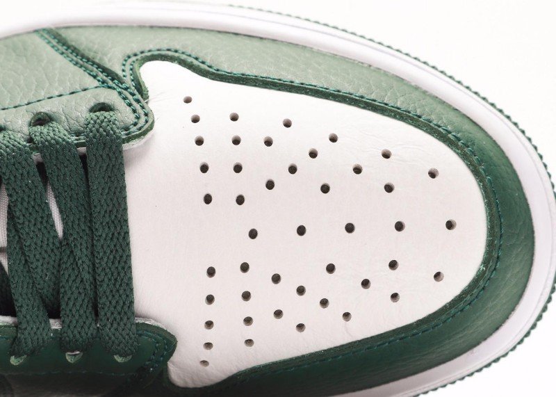 Toe cap and mid-section use white leather with fine perforations; dark green leather sides and rear with smooth texture; The silver Swoosh logo uses metallic material with bright luster; dark green laces with metallic eyelets; white midsole with dark green rubber outsole providing excellent grip.