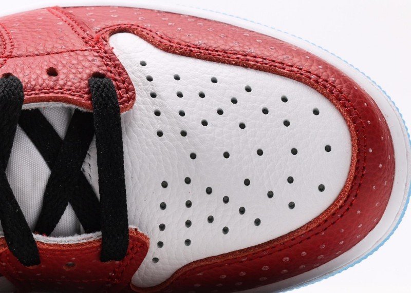 Left upper features red crocodile-pattern leather with delicate texture; White leather toe cap with dense ventilation holes; black collar area with Jumpman logo for exquisite details; light blue transparent crystal sole on forefoot and heel edges adds uniqueness.