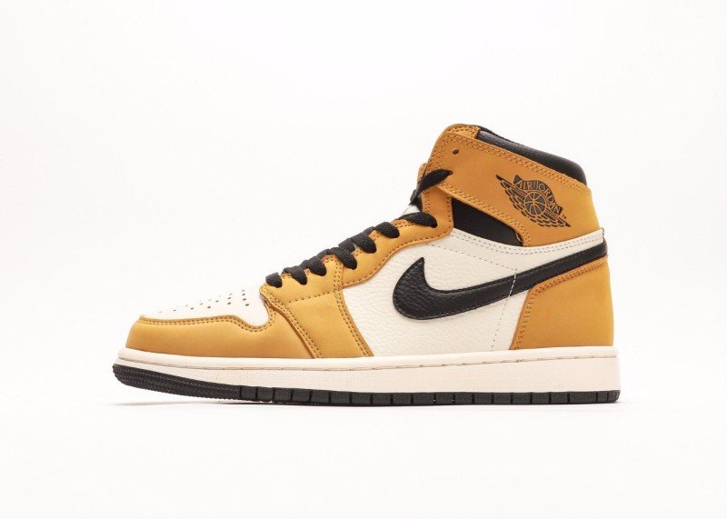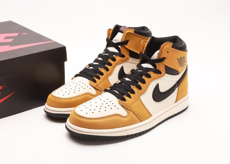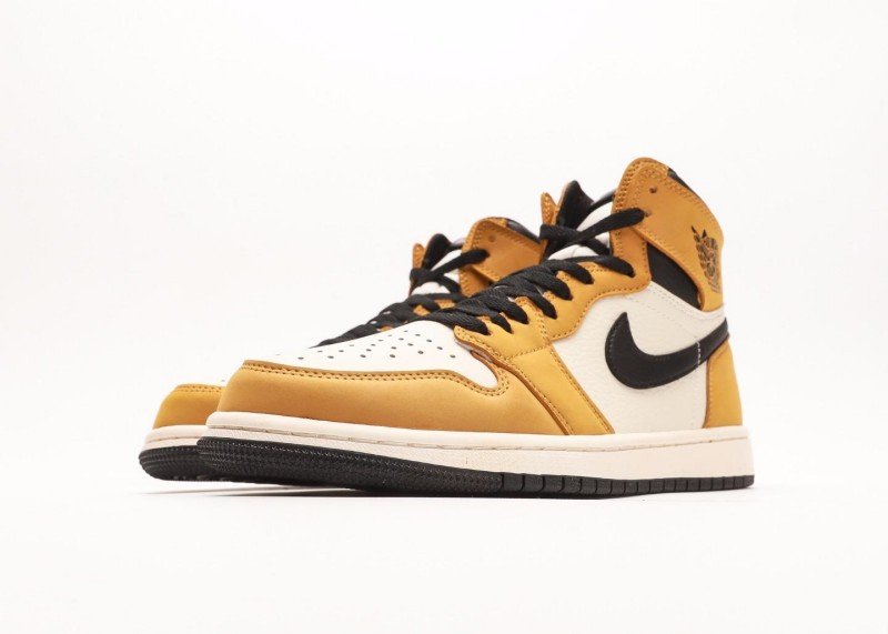 Air Jordan 1 High Sneaker features yellow-white-black color scheme, reinventing retro street style. Yellow leather toe cap paired with white mid-panel, accented by black Swoosh logo, cream midsole contrasting with black outsole, showcasing perfect fusion of energy and fashion.
