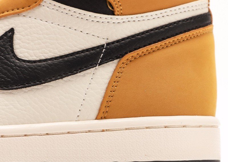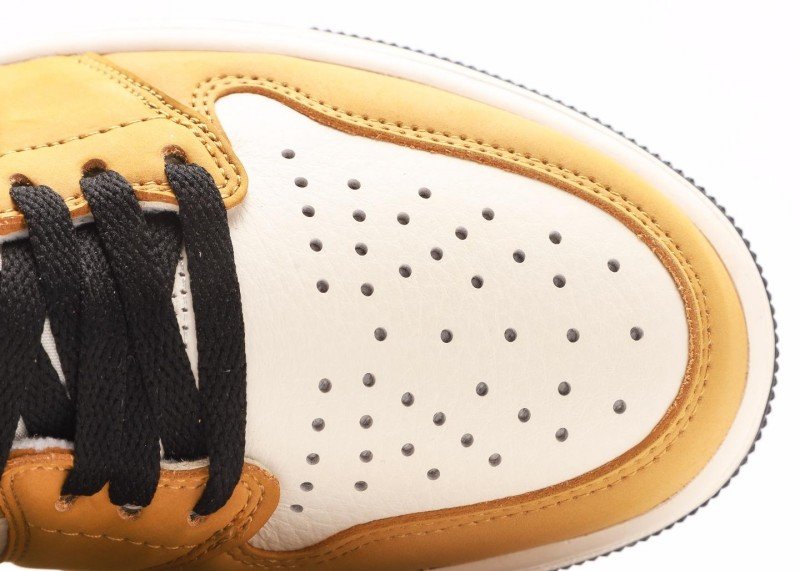 Black Swoosh logo on side with smooth lines, black Jumpman logo on lateral collar with clear details. Yellow leather toe cap has full luster, white mid-panel perforations enhance air flow, exquisite craftsmanship highlights quality in details.