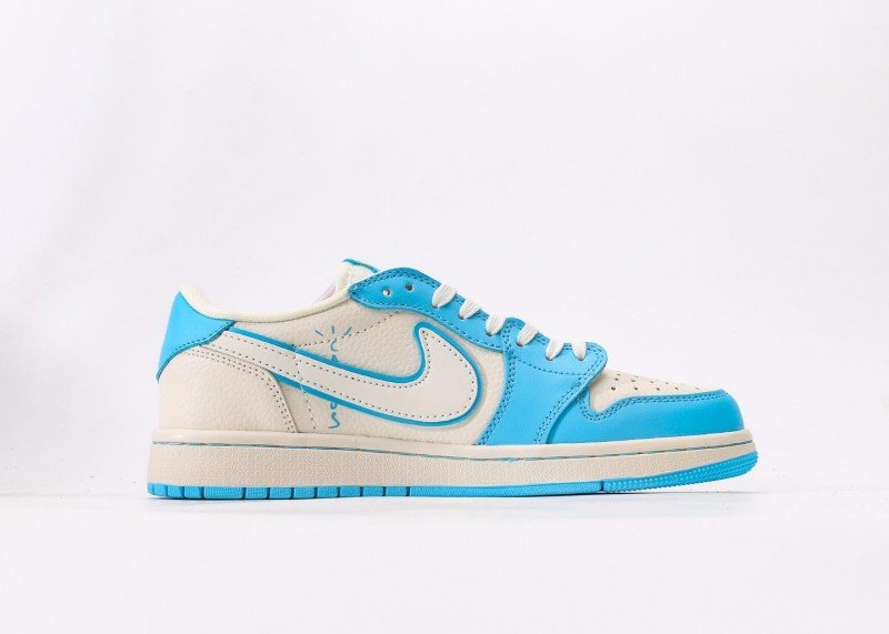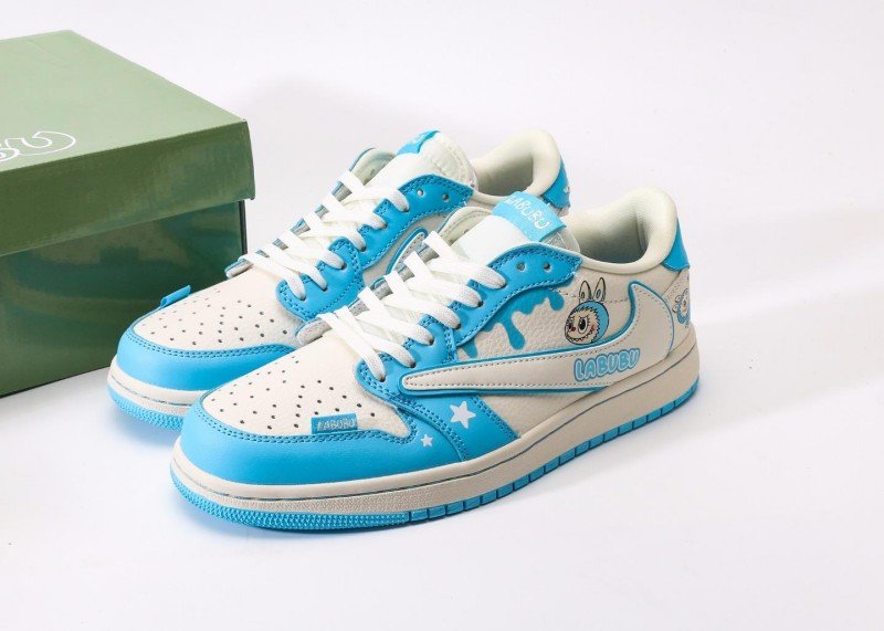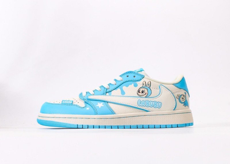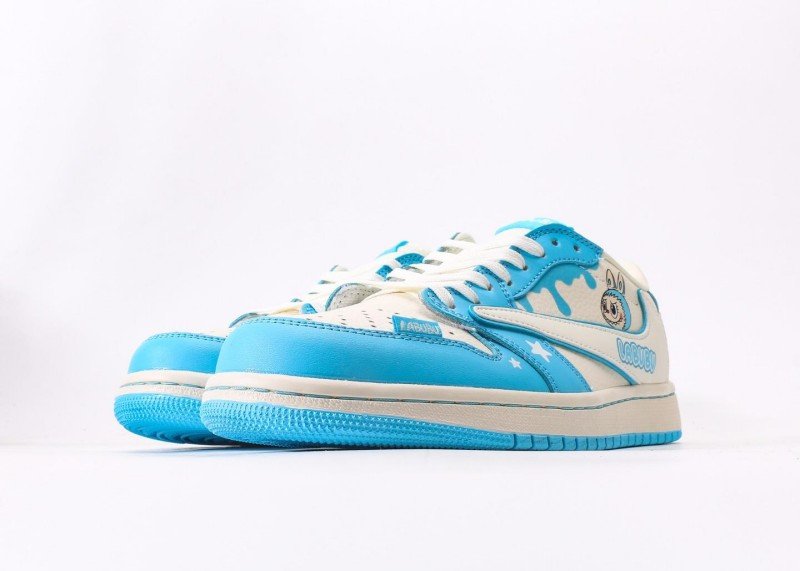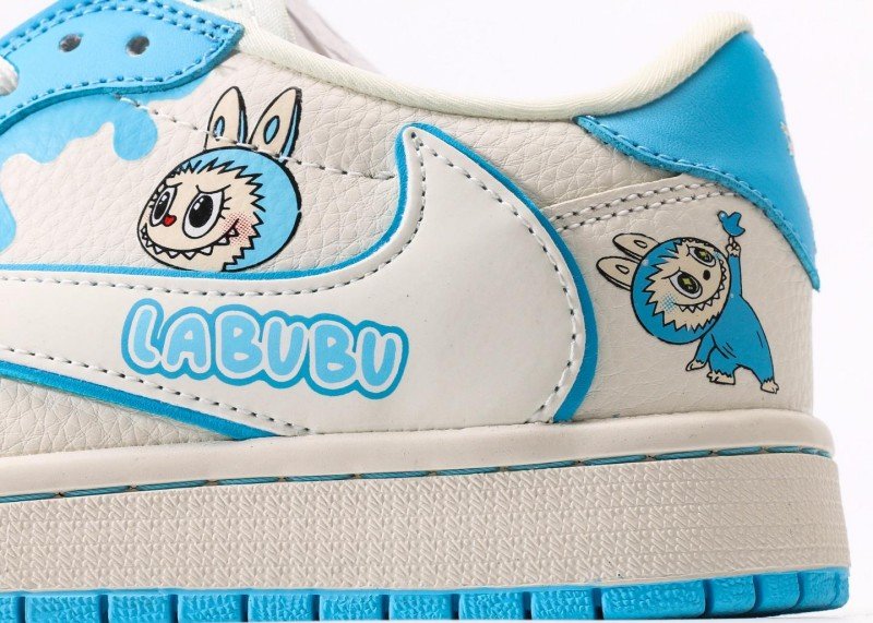 This LABUBU Collaborative Blue-White Air Jordan 1 Low is a crossover between Jordan Brand and LABUBU, combining blue-white patchwork with cartoon elements to reshape fresh playful trend, becoming a summer essential for toy enthusiasts.