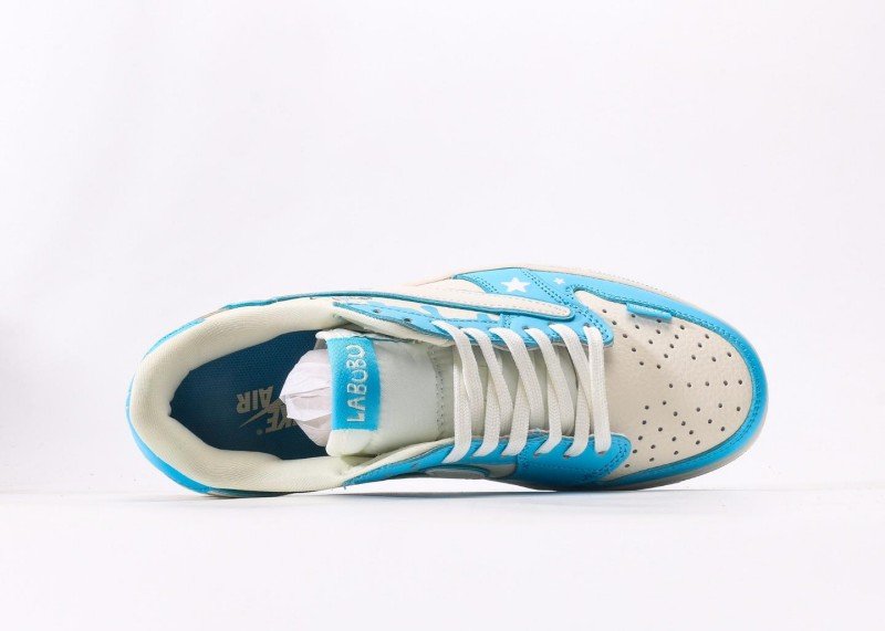 The light blue Swoosh logo on the side features LABUBU cartoon avatar, toe “milk drop” pattern and stars add cuteness, small cartoon character on the heel echoes the theme, “LABUBU” lettering in playful font, full of details.