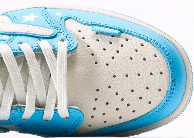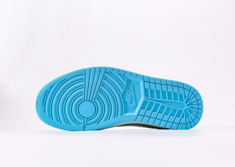 The upper uses leather and synthetic leather splicing, light blue areas are smooth, white parts with breathable mesh design, lightweight Phylon midsole, blue rubber outsole with纹路 for wear resistance and grip, light walking comfort.