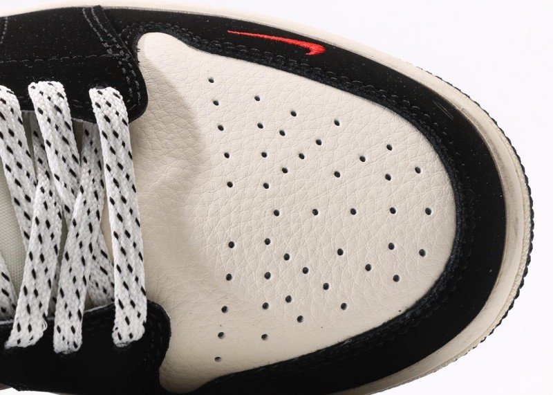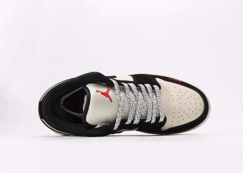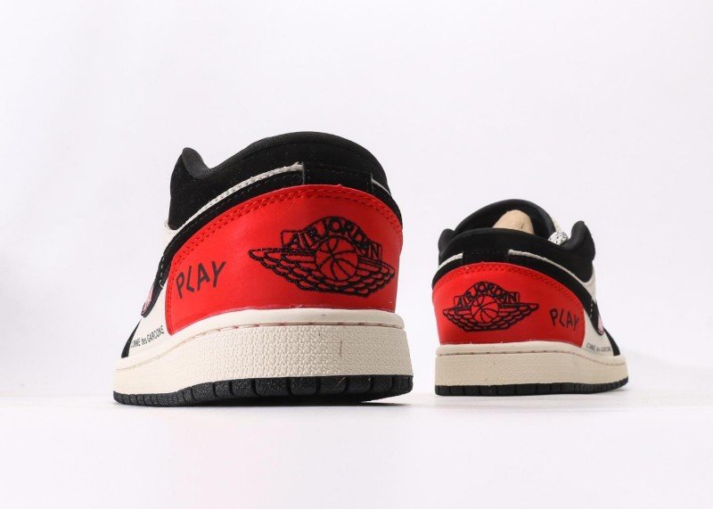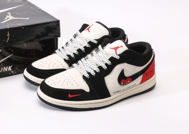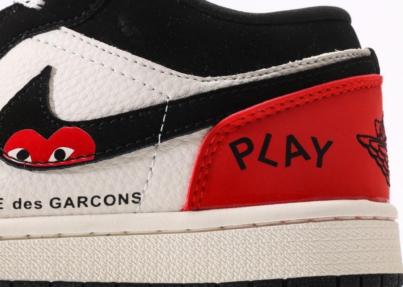 This black-white-red collaborative Air Jordan 1 Low is a crossover between Jordan Brand and COMME des GARÇONS, combining contrast colors with cartoon eye elements to reshape street fashion aesthetics, becoming a collectible collaborative item.