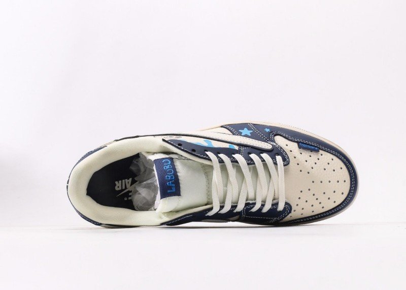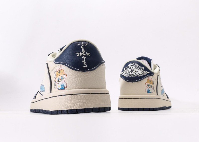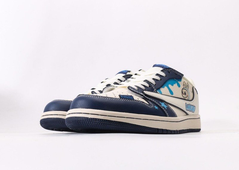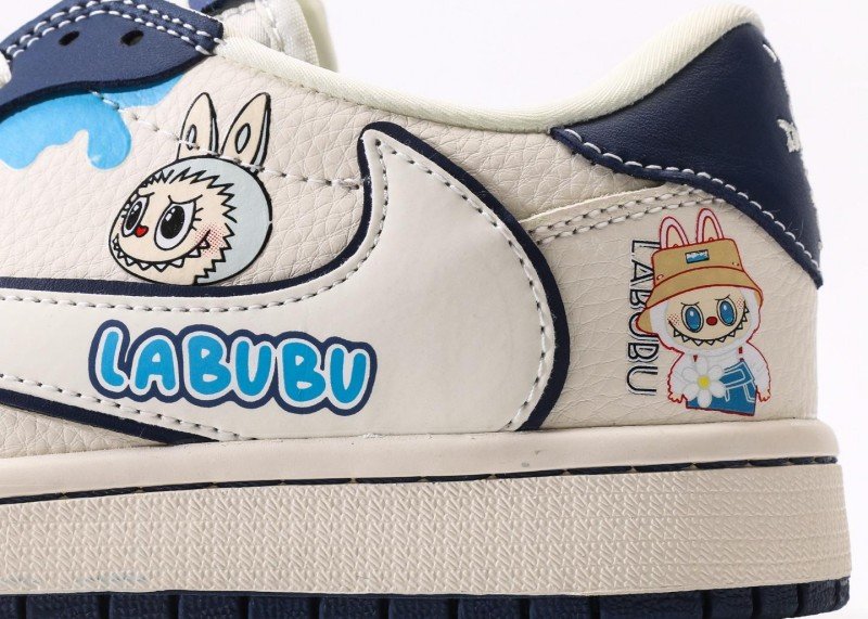 This LABUBU collaborative blue-white cartoon Air Jordan 1 Low is a healing collaboration between Jordan Brand and LABUBU, combining blue-white patchwork with cartoon elements to reshape playful trend aesthetics, limited to 5000 pairs globally, a must-have for toy enthusiasts.