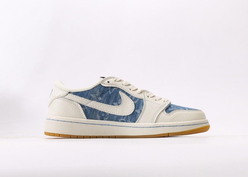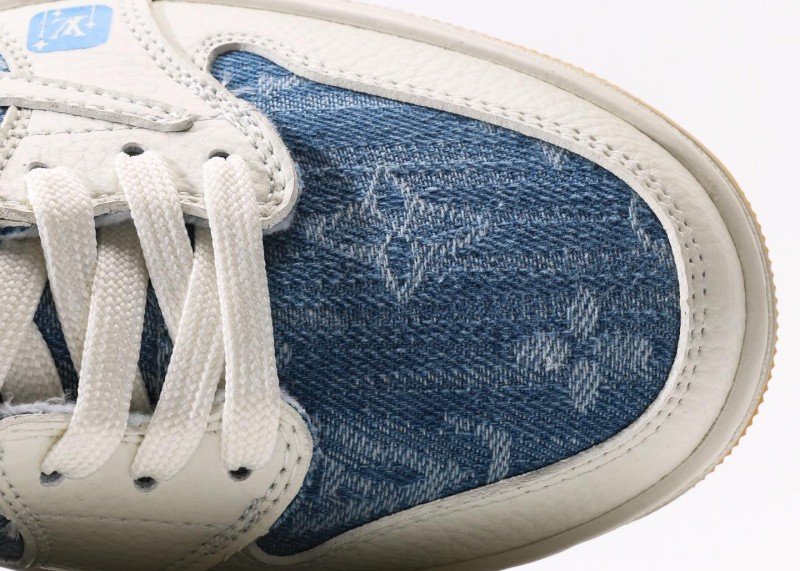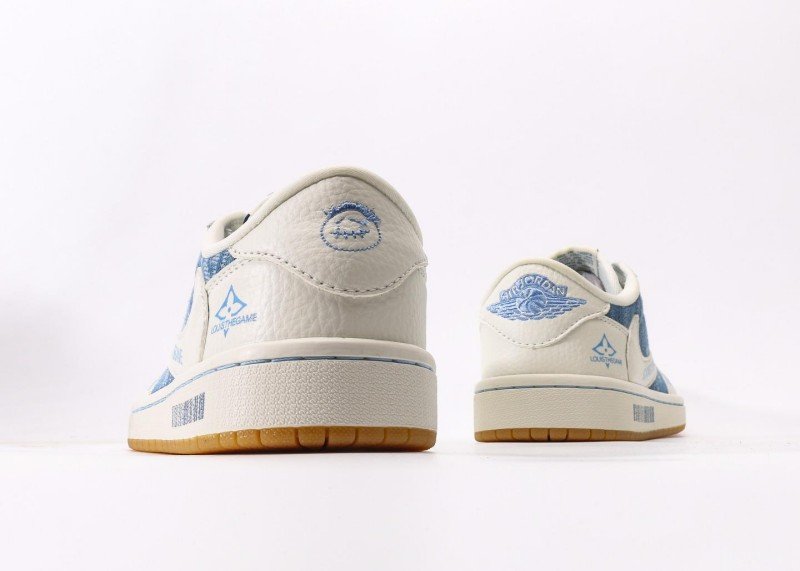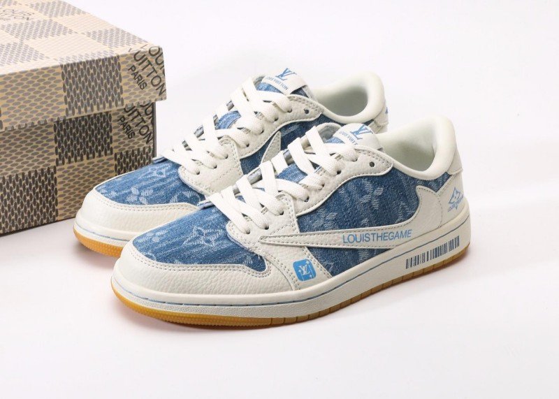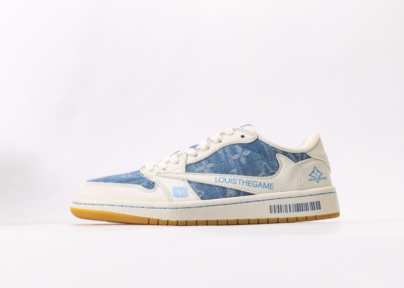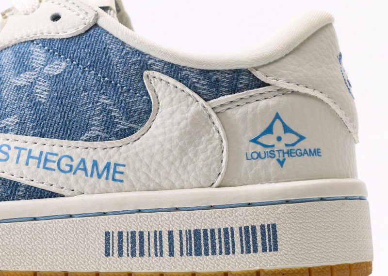 The Swoosh-shaped denim decoration on the side echoes the light blue “LOUISTHEGAME” lettering. The diamond-shaped blue heel logo highlights the collaborative identity, and the beige rubber sole with black barcode pattern on the side blends retro with technology.