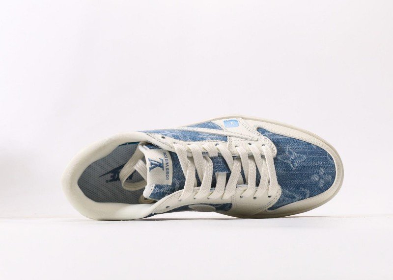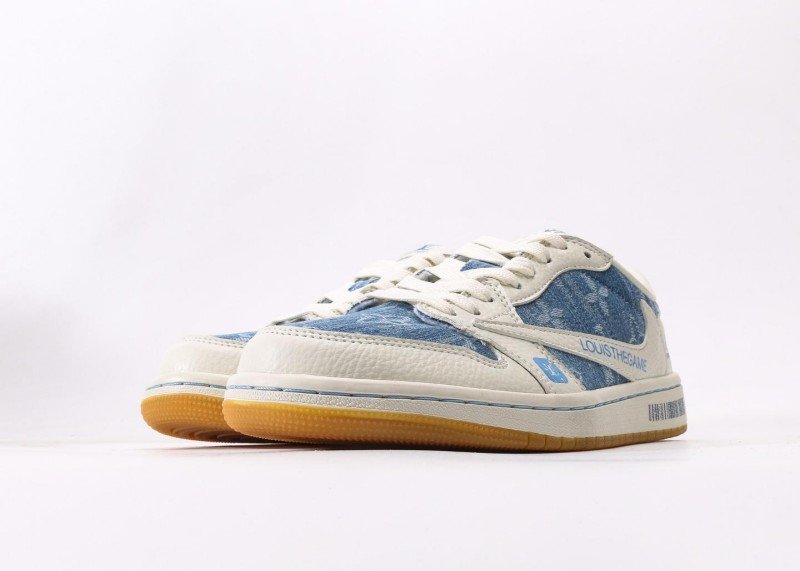 This white-blue denim patchwork skate shoe from LOUISTHEGAME collaboration combines white leather with blue denim, reshaping retro street style and becoming a must-have for trendsetters.