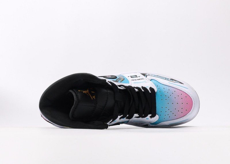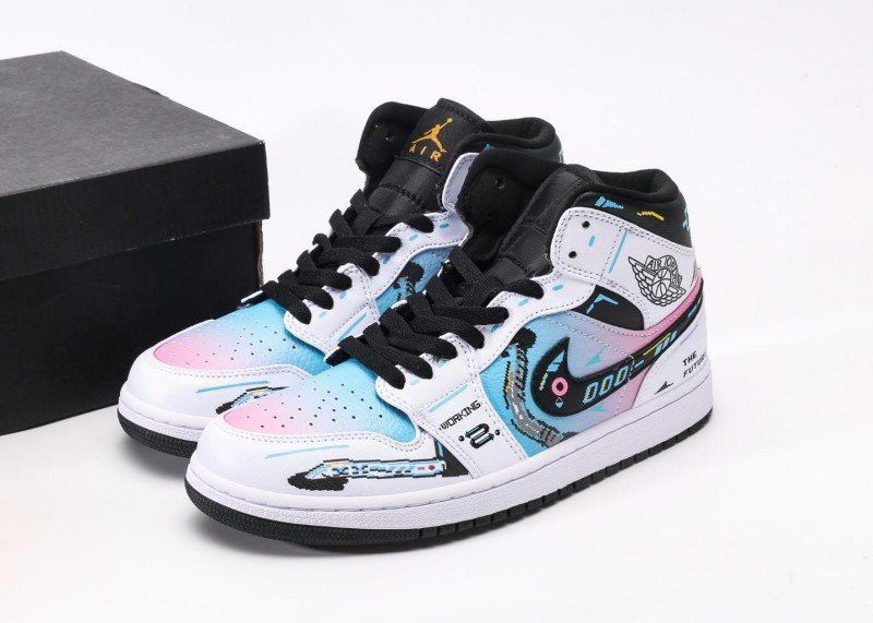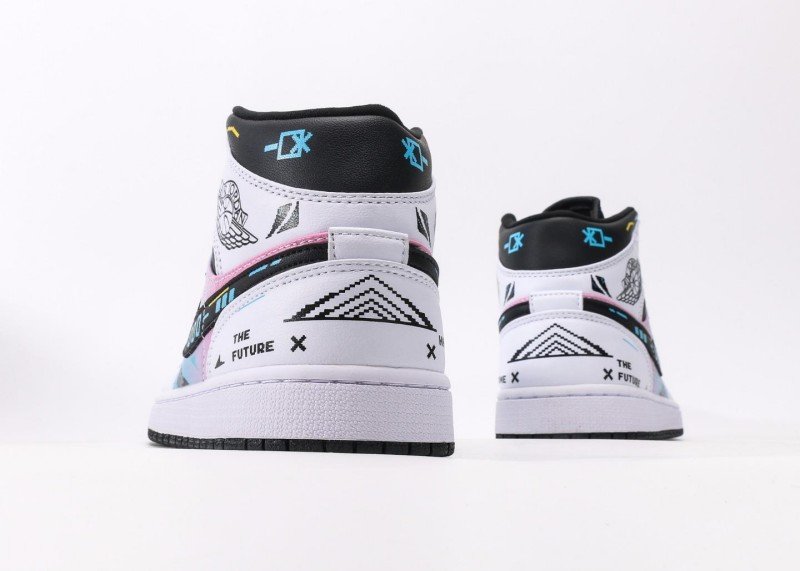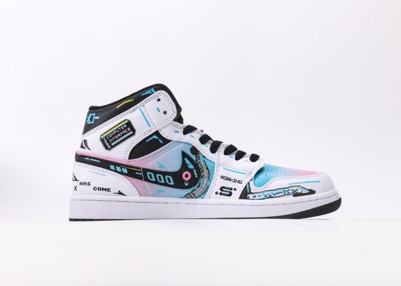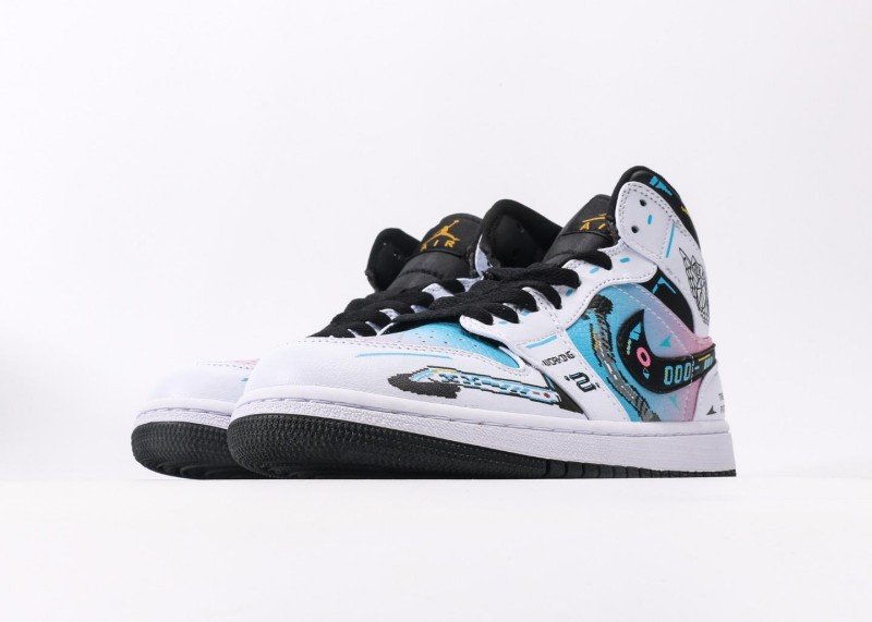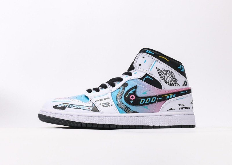 Air Jordan 1 Retro Mid Sneaker features white-black gradient with future-themed elements, reinventing tech fashion style. White upper paired with colorful gradient Swoosh logo, black details and abstract patterns adding layers, showcasing perfect fusion of future tech and fashion, suitable for innovative trend enthusiasts.