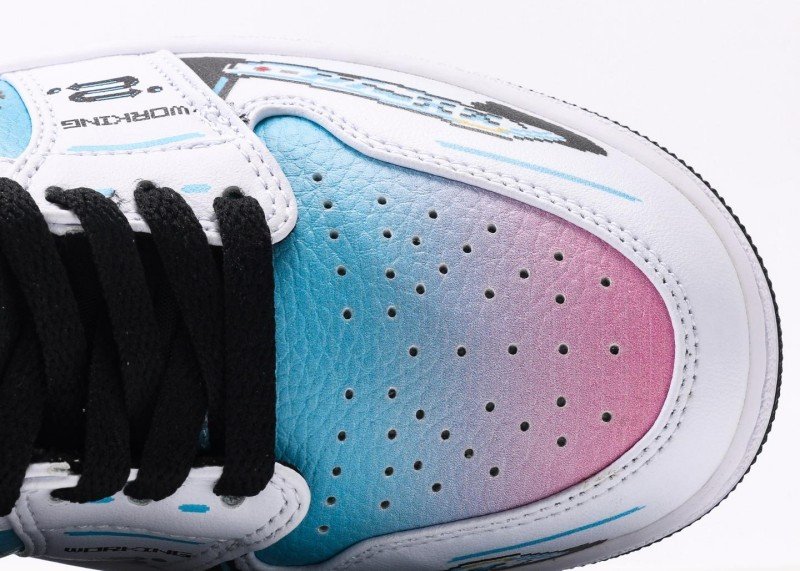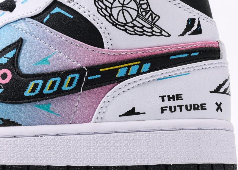 Colorful gradient Swoosh logo transitions from blue-purple to pink, creating strong visual impact. Black wing pattern with white interior and pink-blue edge lines, blue “23” number eye-catching. “THE FUTURE” lettering on heel with yellow stitching, overall design full of futuristic tech sense, highlighting unique personality.