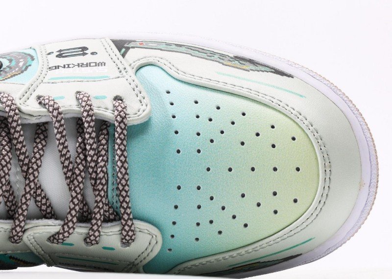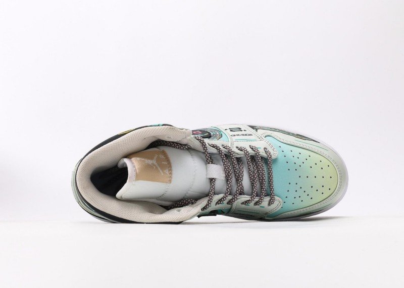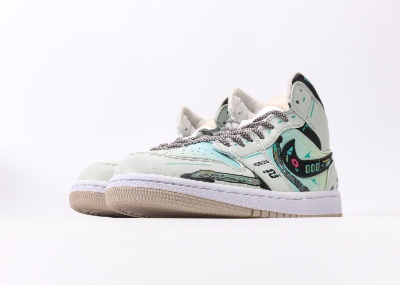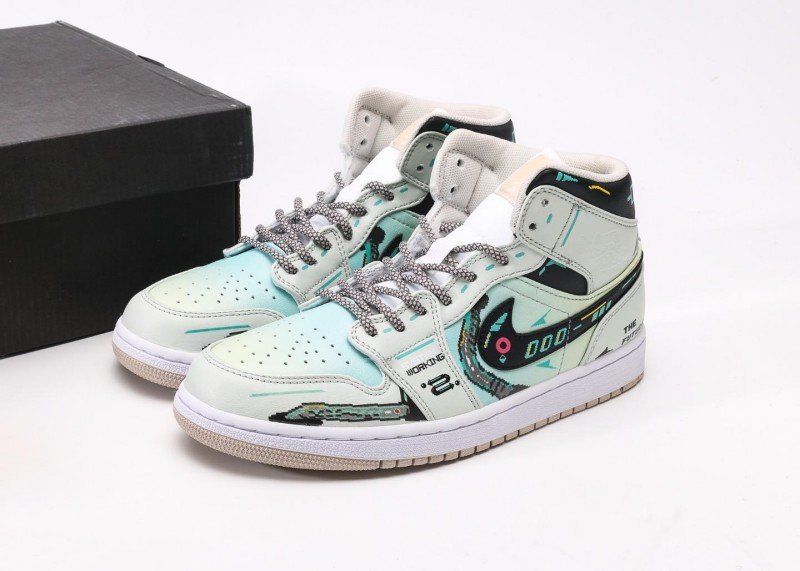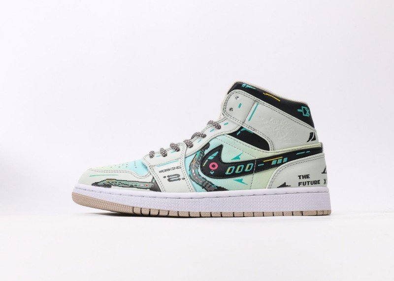 Air Jordan 1 Retro Mid Sneaker features light green base with colorful future-themed elements, reinventing tech fashion style. Light green upper paired with colorful patterns and lettering, black details adding layers, showcasing perfect fusion of future tech and fashion, suitable for innovative trend enthusiasts.