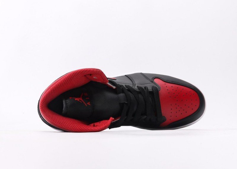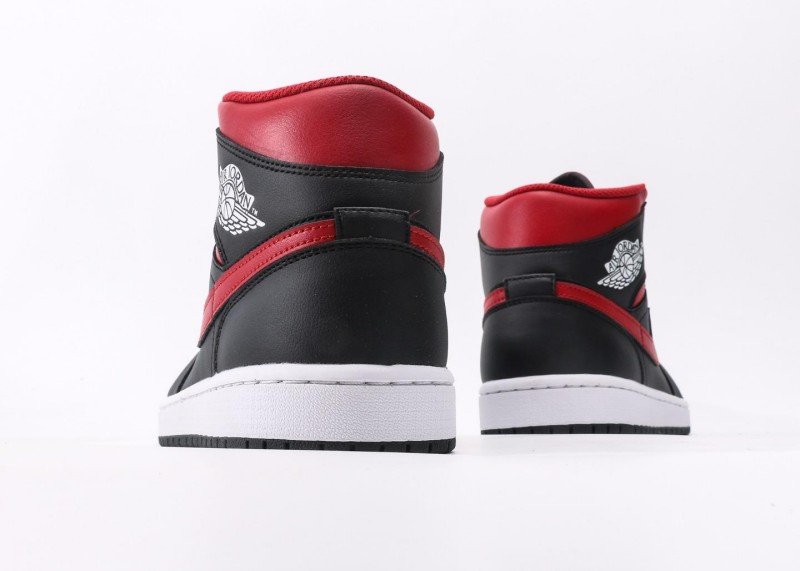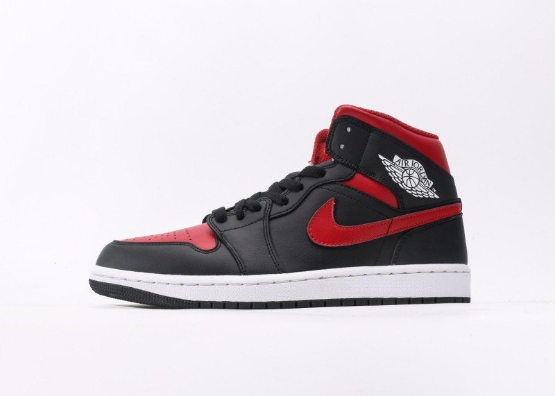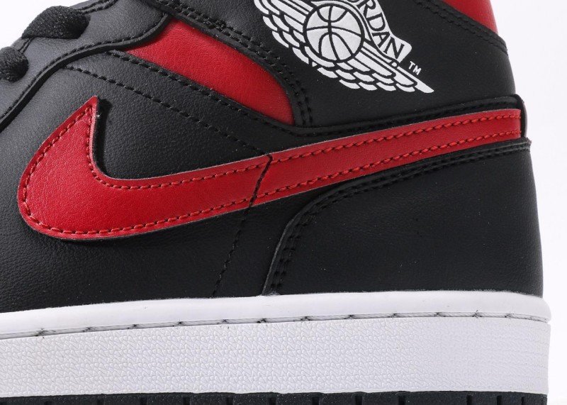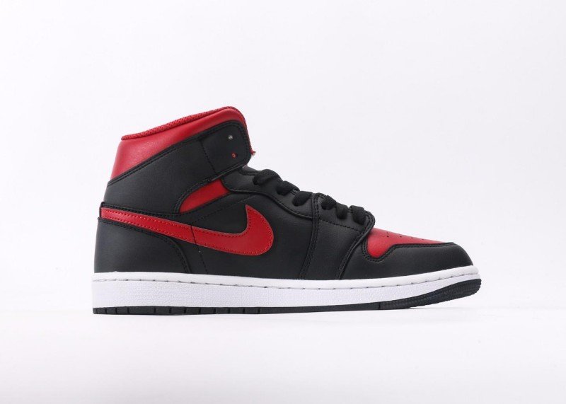 Air Jordan 1 Retro Mid Sneaker features black-red classic colorway, reinventing retro trend style. Black leather upper paired with red Swoosh logo and toe cap, striking color contrast showcases perfect fusion of energy and fashion, suitable for classic-loving trend enthusiasts.