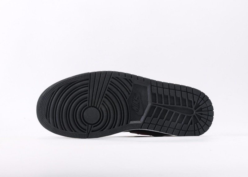 Red Swoosh logo on side with smooth lines, creating strong contrast with black upper. White “AIR JORDAN” logo on lateral collar with clear basketball pattern. Red collar top with black upper for classic color matching, white midsole contrasting with black outsole enhances visual impact, overall design is simple yet distinctive.