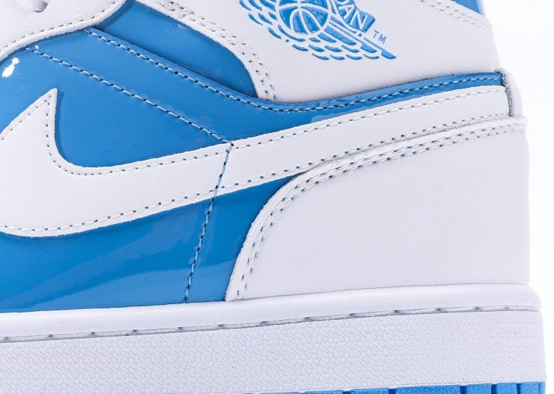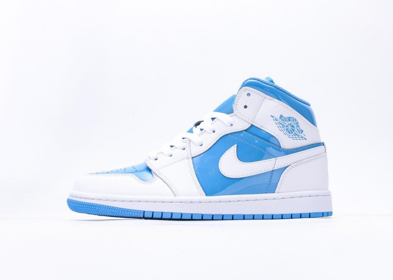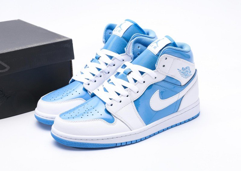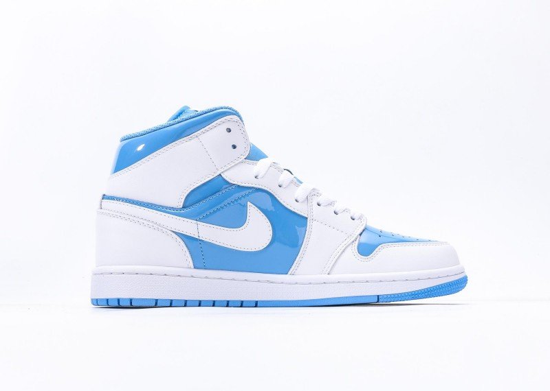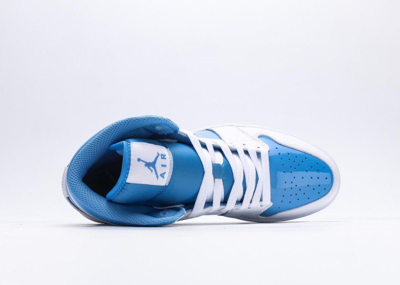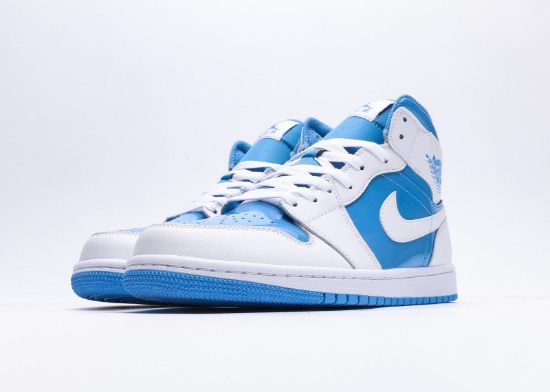 Air Jordan 1 Retro Mid Sneaker features blue-white color scheme, reinventing fresh fashion style. Navy leather upper paired with white mid-panel, striking color contrast showcases perfect fusion of energy and fashion, suitable for fresh style enthusiasts.