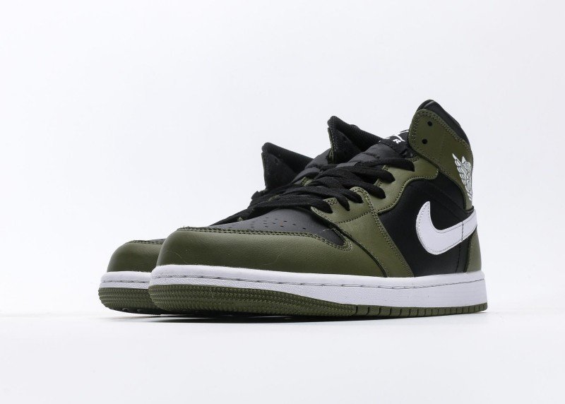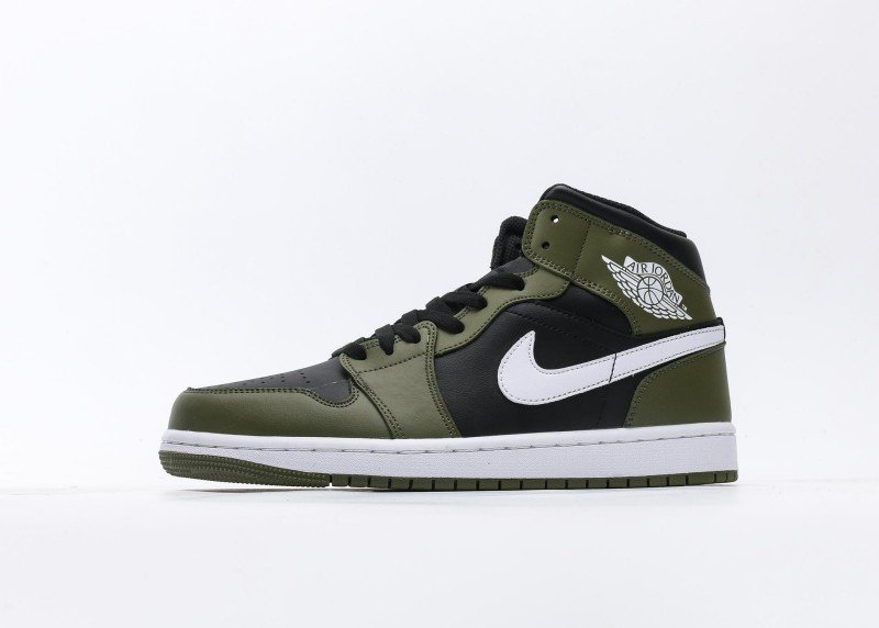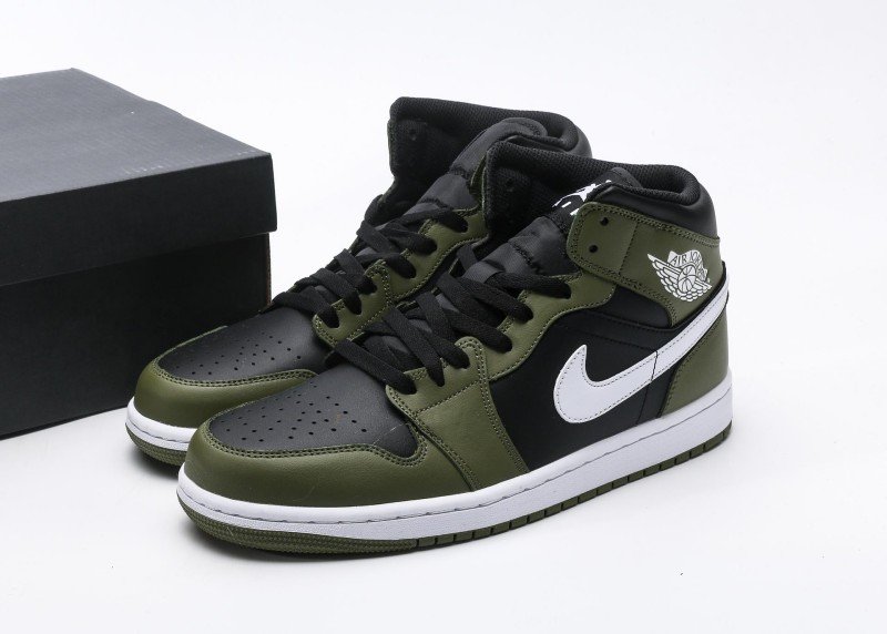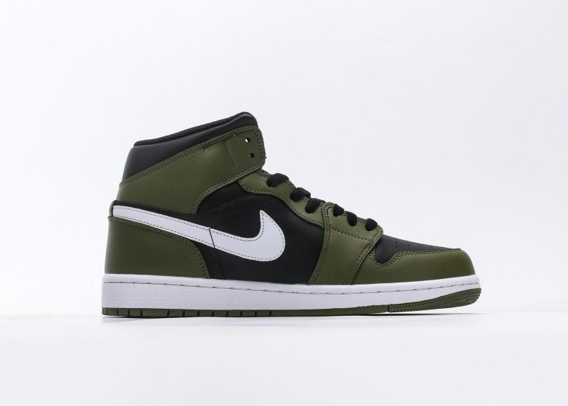 Air Jordan 1 Retro Mid Sneaker features olive green-black color scheme, reinventing sophisticated fashion style. Olive green leather upper paired with black details, soft color contrast showcases perfect fusion of understated luxury and modern fashion, suitable for quality-conscious individuals.