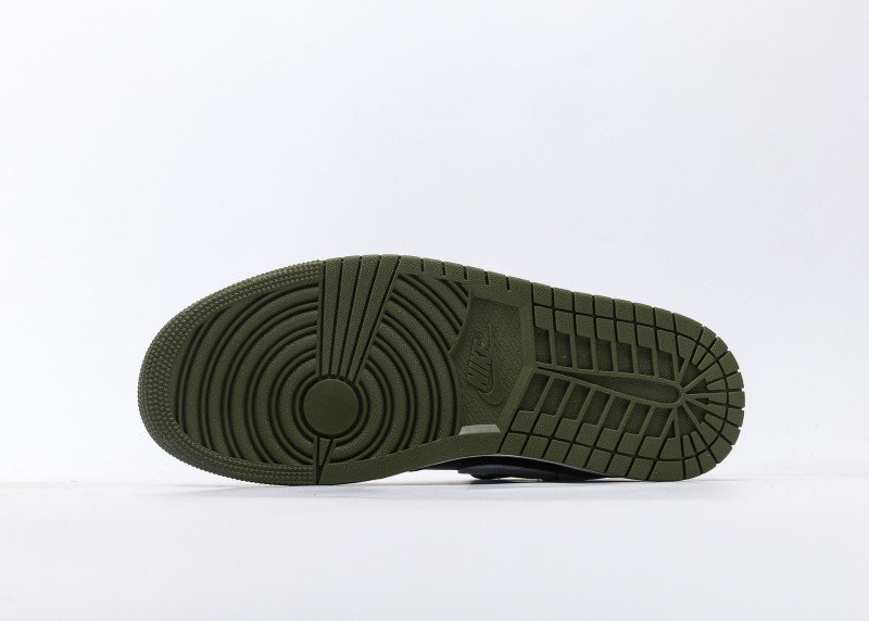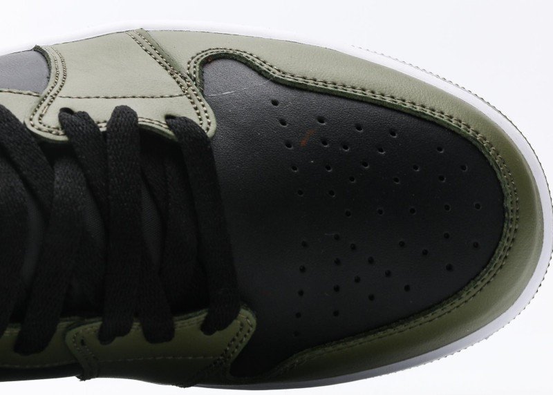 Toe cap and side panels use black leather with smooth texture; olive green leather mid-panel with fine perforations; white Swoosh logo and AIR JORDAN logo with shiny finish; black laces through black tongue’s black eyelets; white midsole with olive green rubber outsole providing excellent grip.